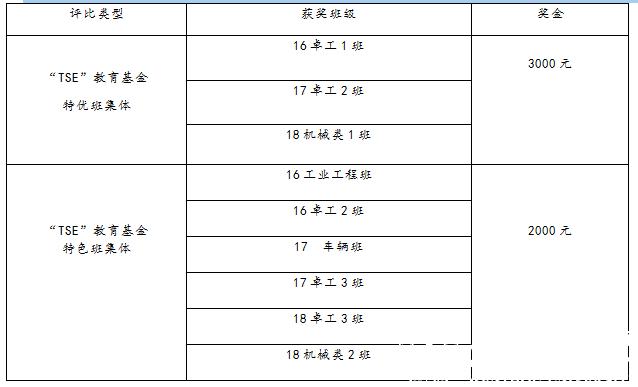 “TSE”教育基金由宁波兴茂电子科技有限公司出资设立,特别设置了特优班集体和特色班集体奖项。特优、特色班集体评比涉及学风建设、学生团建、科技竞赛、创新创业、考级考证、新闻宣传以及考研就业七个特色项目。经过前期各班申报、年级委员会初评、双赢彩票 资格审核和双赢彩票 联评大会,并由教师评委和学生评委投票,最终评选出16卓工1班、17卓工2班、18机械类1班3个特优班集体和16卓工2等6个特色班集体。名单如下: