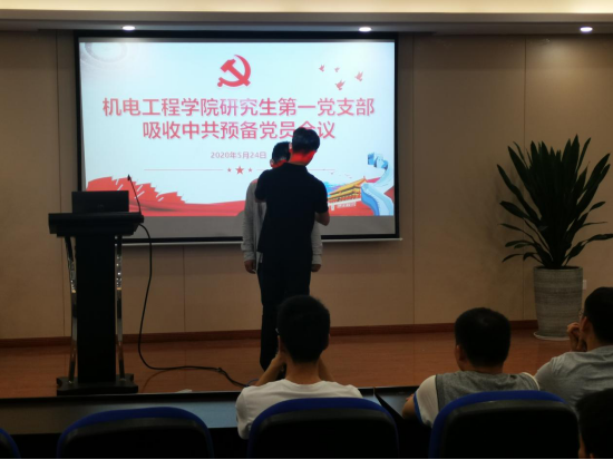 之后,研究生第一党支部书记姚旭凯同志为新发展的张成龙同志佩戴党员徽章并带领全体参会的党员同志面对党旗,庄严宣誓。
