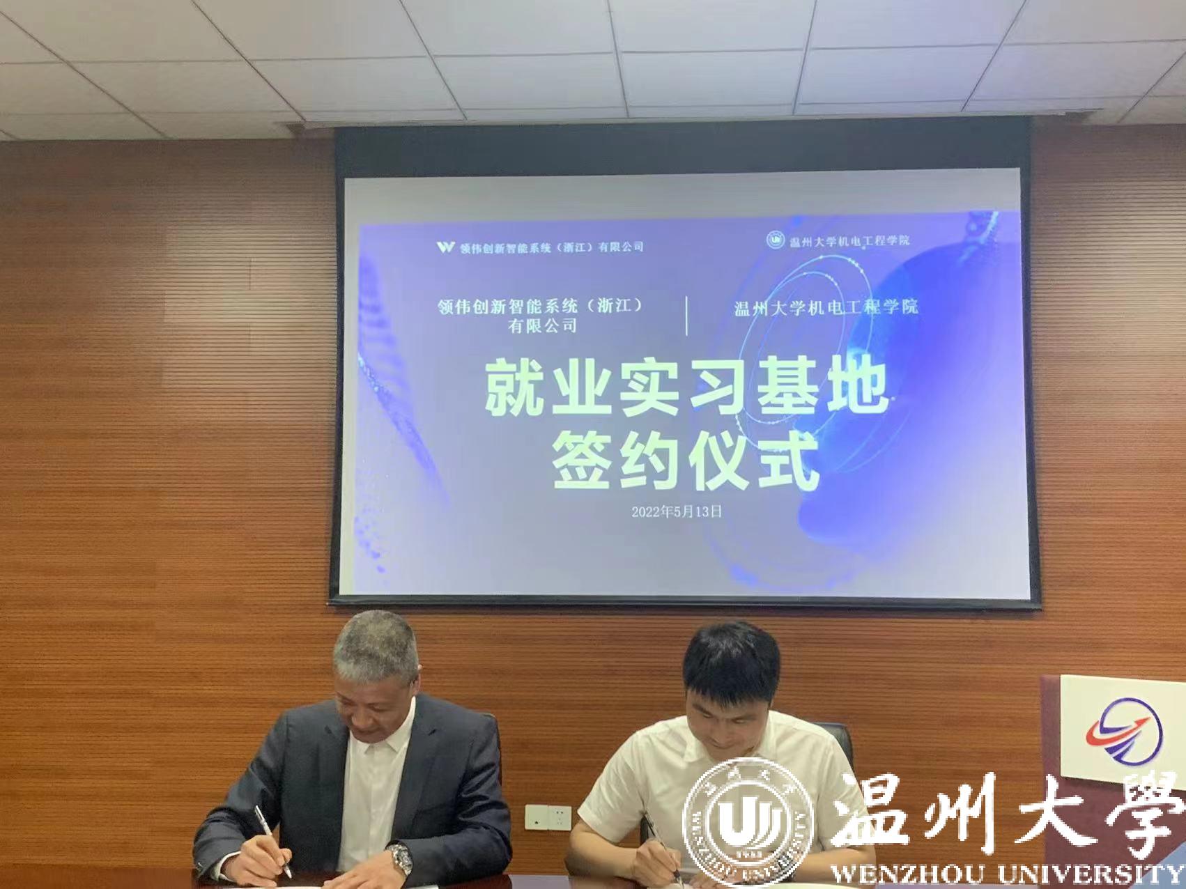 周荣书记、李小刚董事长代表校企双方签订就业实习合作协议,周荣书记向领伟创新智能系统(浙江)有限公司授牌,正式在该公司建设“双赢彩票 就业实习基地”。