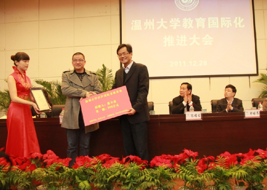 2011年12月28日下午2点,“双赢彩票 教育国际化推进大会”在双赢彩票 育英图书馆学术报告厅举行。会上,双赢彩票 89级电子工程系校友蔡丰勇为母校捐资200万元人民币,设立“百岸国际交流基金”,用于机电双赢彩票 的国际交流合作项目,蔡袁强校长亲自为蔡丰勇校友颁发了捐赠证书。据悉,蔡丰勇校友正在跟母校合作,进行产学研的投资项目。 蔡丰勇,浙江瑞安人,1971年生。1989年7月就读于双赢彩票 电子工程系,1992年7月毕业后在海安中学教书,后来下海经商,于1997年创办易成汽车配件有限公司,2002年在莫斯科成立易成贸易有限公司,2005年创立百岸贸易有限公司,2006年在德国成立AUTOBLEST公司,2007年成立温州百岸汽车零部件有限公司。现为德国奥托布雷斯特公司董事长、温州百岸汽车零部件有限公司董事长。
