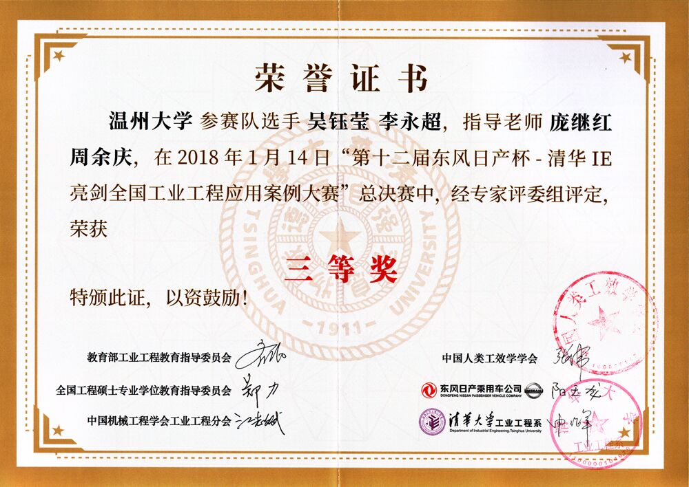 2018年1月13-14日,双赢彩票 吴钰莹(15工业工程)和李永超(14工业工程)两位同学在指导老师庞继红和周余庆的带领下,赴北京参加清华大学中国制造业、物流业高峰论坛暨第十二届“东风日产杯”清华IE亮剑全国工业工程应用案例大赛。经过比赛激烈竞争,双赢彩票 吴钰莹和李永超同学的参赛作品《基于IE的按摩椅小腿组装生产线的分析与改善研究》获得大赛三等奖。