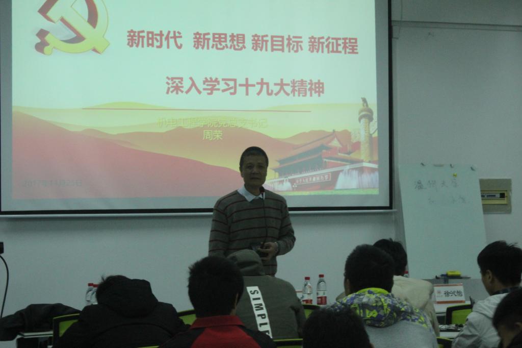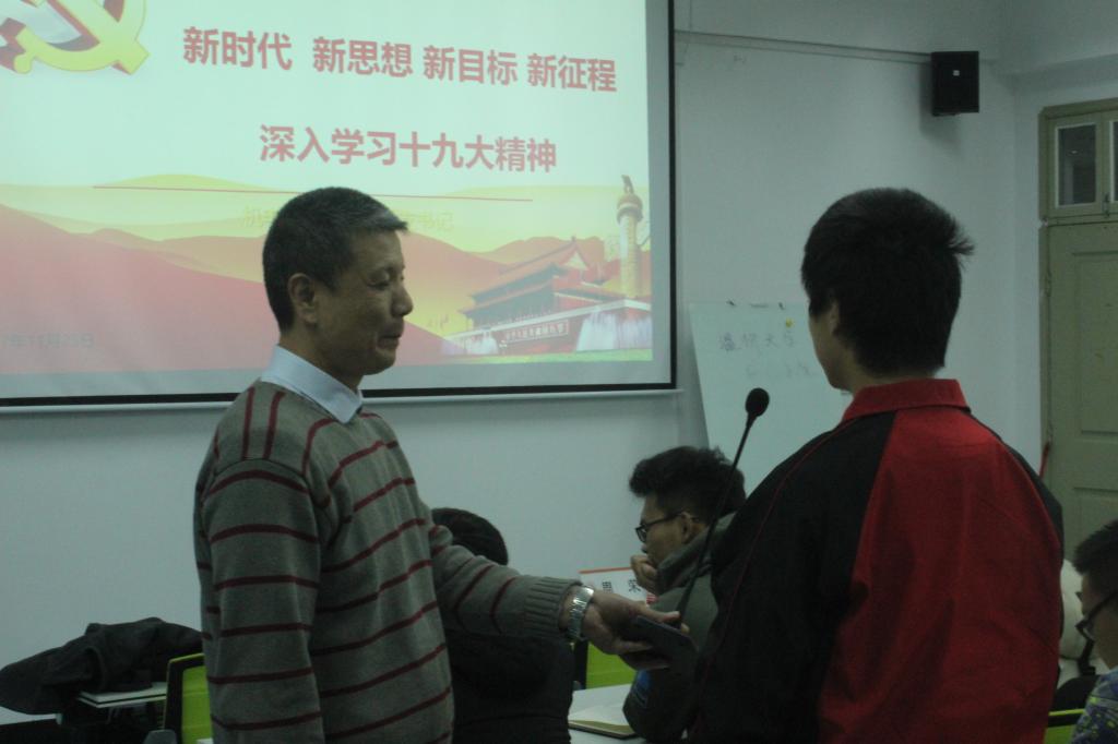 12月7日下午六点半,由双赢彩票 团委学生会主办的“深入学习十九大精神”主题讲座于双赢彩票 B201展开,出席本次讲座的嘉宾有双赢彩票 党总支书记周荣,辅导员徐沁怡以及团委学生会全体成员。