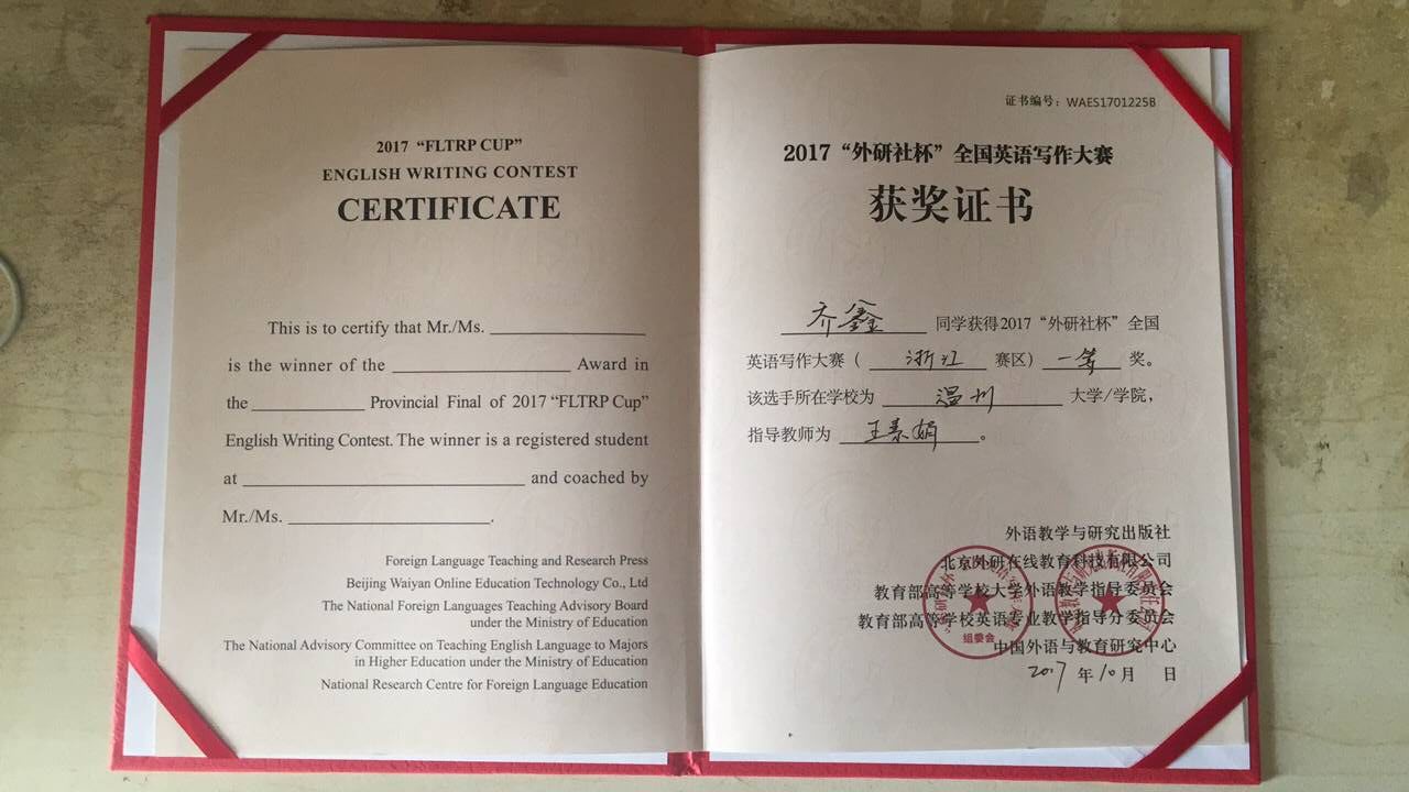 英语是国际指定的官方语言,也是世界上最广泛的第一语言。为助推双赢彩票 “十三五”国际化发展这一重要战略目标的实现,提高英语能力是不可小视的重要组成。作为双赢彩票 第一批国际化专业,双赢彩票 的机械工程(国际化)专业在人才培养方面尤其注重学生的外语水平发展,鼓励学生在扎实专业基础的同时,不断提高外语水平,成为真正的国际化人才。2017年10月21日,2017年“外研社杯”全国英语写作和阅读大赛在浙江大学紫金港校区举行。双赢彩票 2015级机械工程(国际化)专业的乔鑫获得写作大赛一等奖,是该项大赛中唯一一位非英语专业的获奖选手。此次获奖离不开乔鑫平时的认真努力以及赛前的刻苦训练,也体现了双赢彩票 在国际化专业建设中语言能力培养方面的成果。
