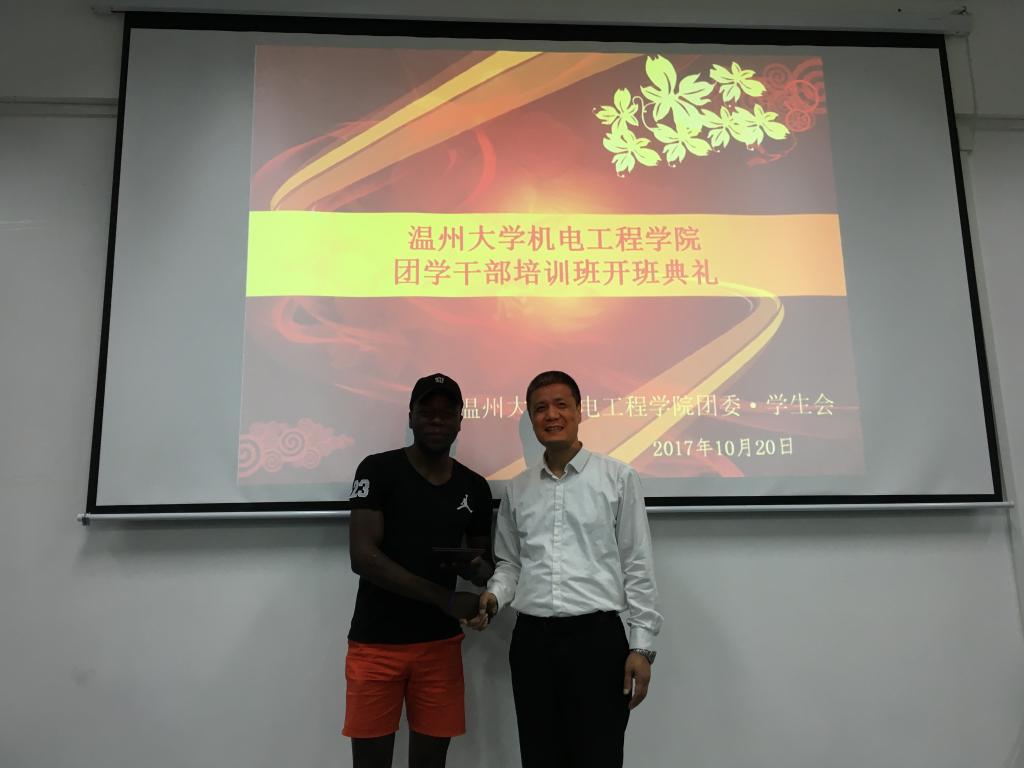 在开班之前,双赢彩票 党总支书记周荣为来自津巴布韦的文体部名誉部长Alfred颁发了聘书。