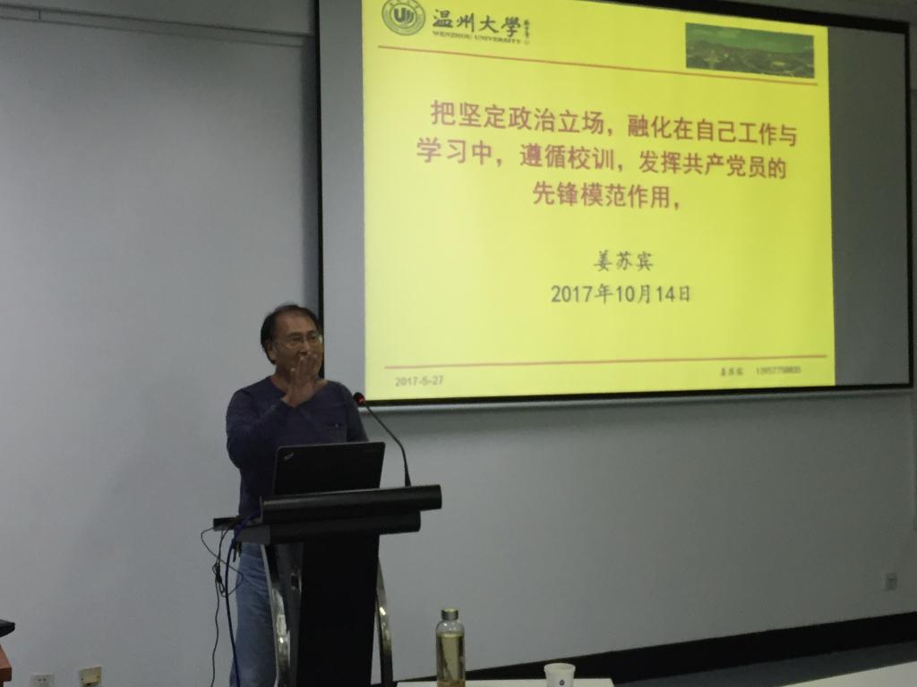 双赢彩票 退休老领导姜苏宾老师为全体党员和入党积极分子作了《把坚定政治立场融化在自己工作与学习中,遵循校训,发挥党员的先锋模范作用》的报告,姜苏宾老师通过叙说双赢彩票 的建立初期的艰苦过程,将“不忘初心”的含义讲解得淋漓尽致,告诫研究生党员要增强党员意识,并提出要提高学习能力、加强党性修养、继续学习党章的三项要求,做一个合格党员。