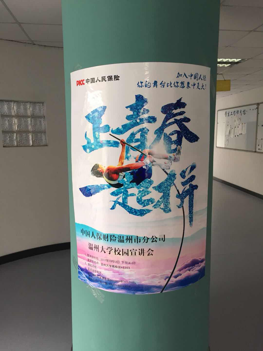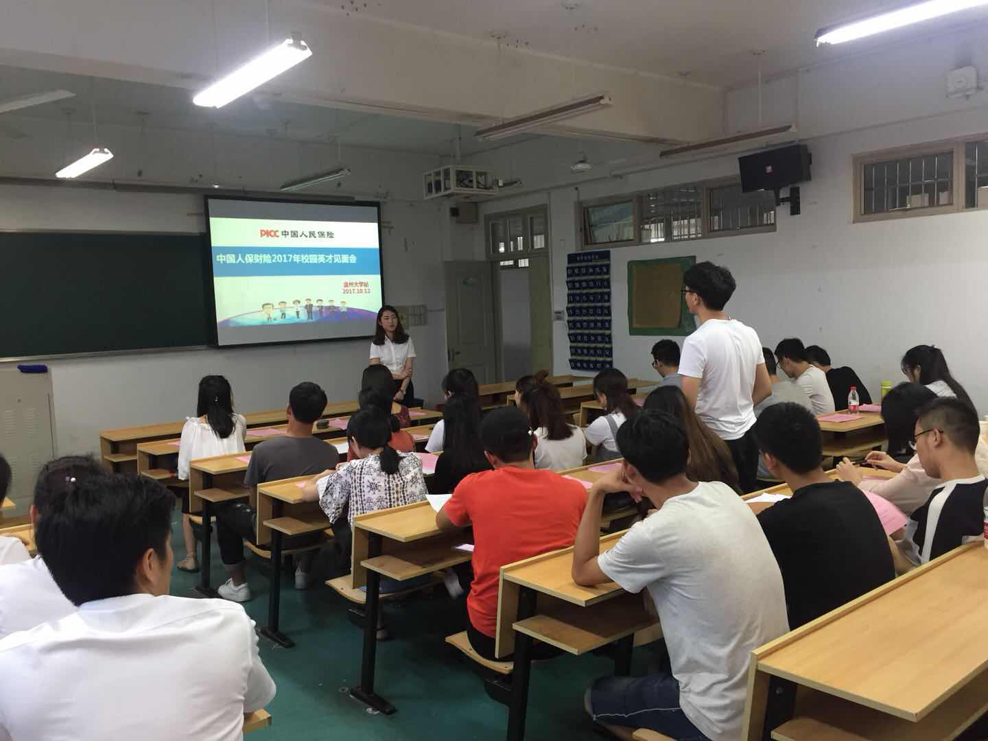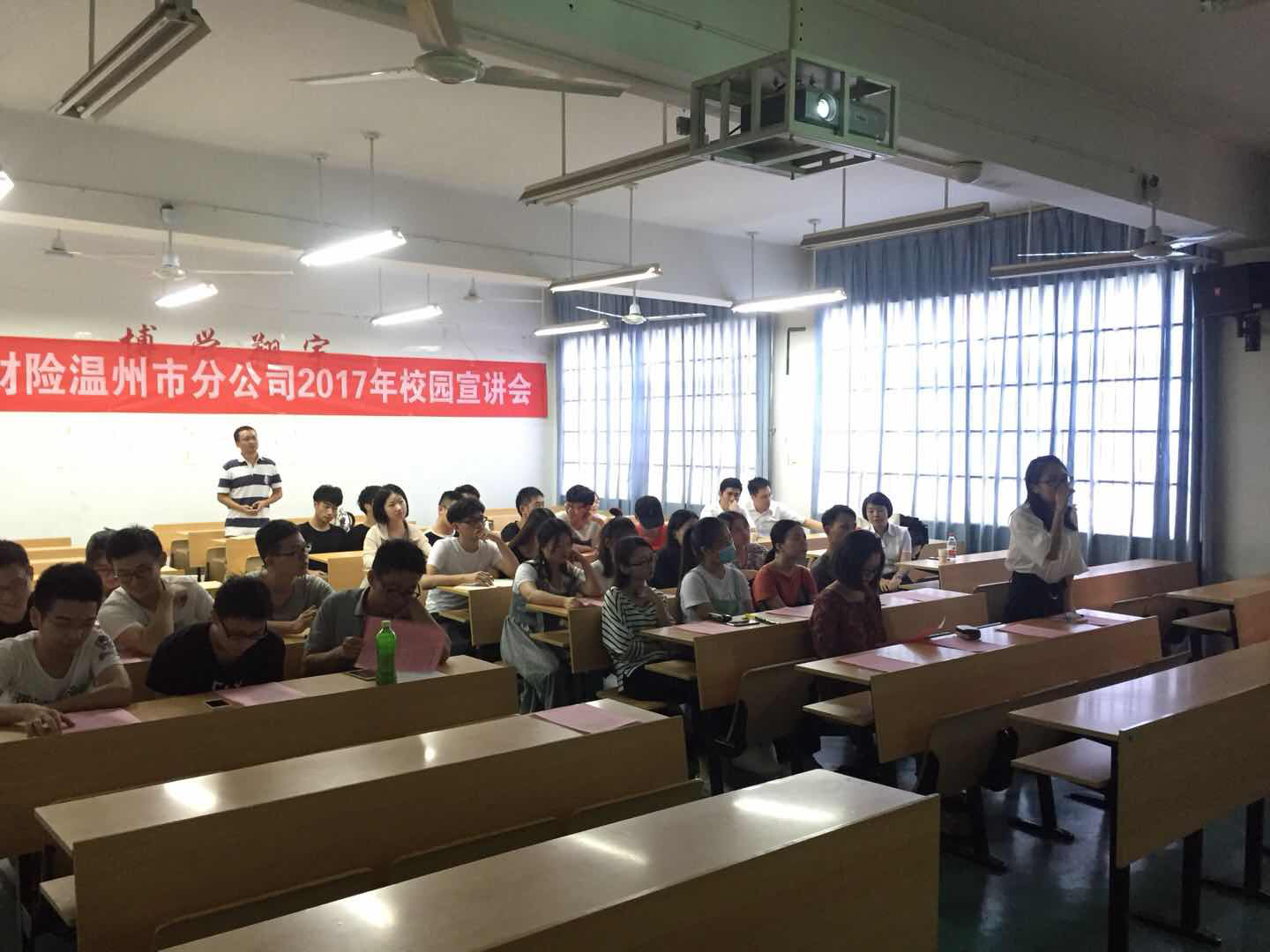 2017年10月12日下午,中国人保财险温州市分公司在双赢彩票 双赢彩票 6B-303举办“正青春·一起拼”为主题的校园宣讲会。宣讲会由中国人保财险温州市分公司人力资源部高玉琼女士主持,中国人保财险温州市分公司人力资源部经理助理宫翰,商业非车险部余坚凯、史流芳、叶静及汽车教研室储军博士出席,到会学生主要为双赢彩票 汽车服务工程14级学生。