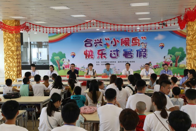 2017年7月6日早上九点,双赢彩票 与合兴集团联合举办的第四期“小候鸟”暑假班的开班仪式开启了。出席本次开班仪式的人员有双赢彩票 党总支副书记李密老师、双赢彩票 林礼区老师、合兴集团党委书记张守奎先生、虹桥镇工会主席李祖义先生,以及来自温大“小候鸟”实践队40位队员和各地的“小候鸟”们。