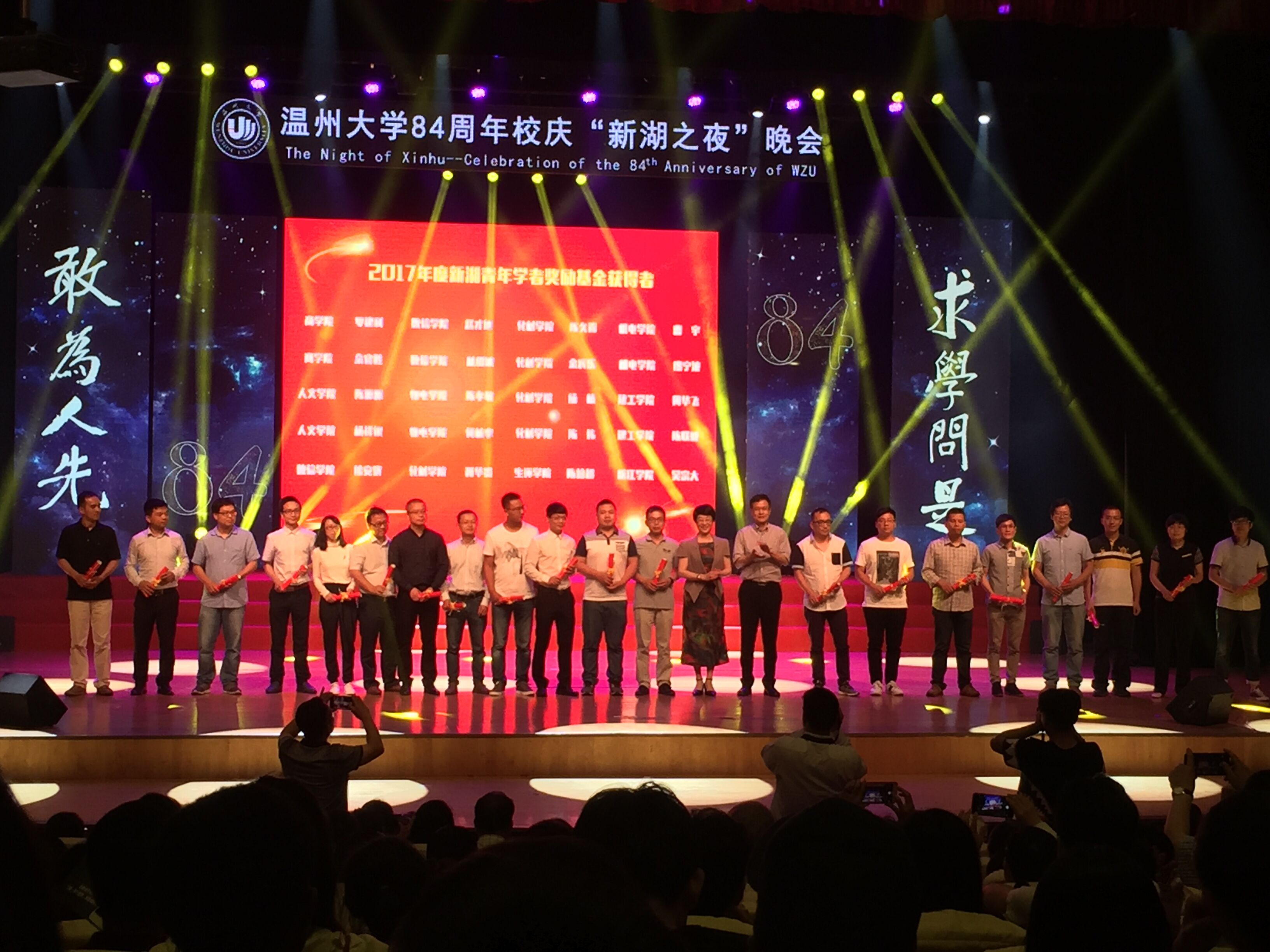 5月19日晚,双赢彩票 84周年校庆“新湖之夜”晚会暨第25届校园文化节开幕式在育英大礼堂隆重举行。晚会上,对2017年度新湖青年学者奖励基金获得者、2017年度“青春温大”榜样人物进行了表彰。双赢彩票 曹宇、廖宁波两位老师喜获2017年度新湖青年学者奖励基金,并接受校党委书记林娟娟和浙江新湖(控股)集团董事长黄伟的颁奖。