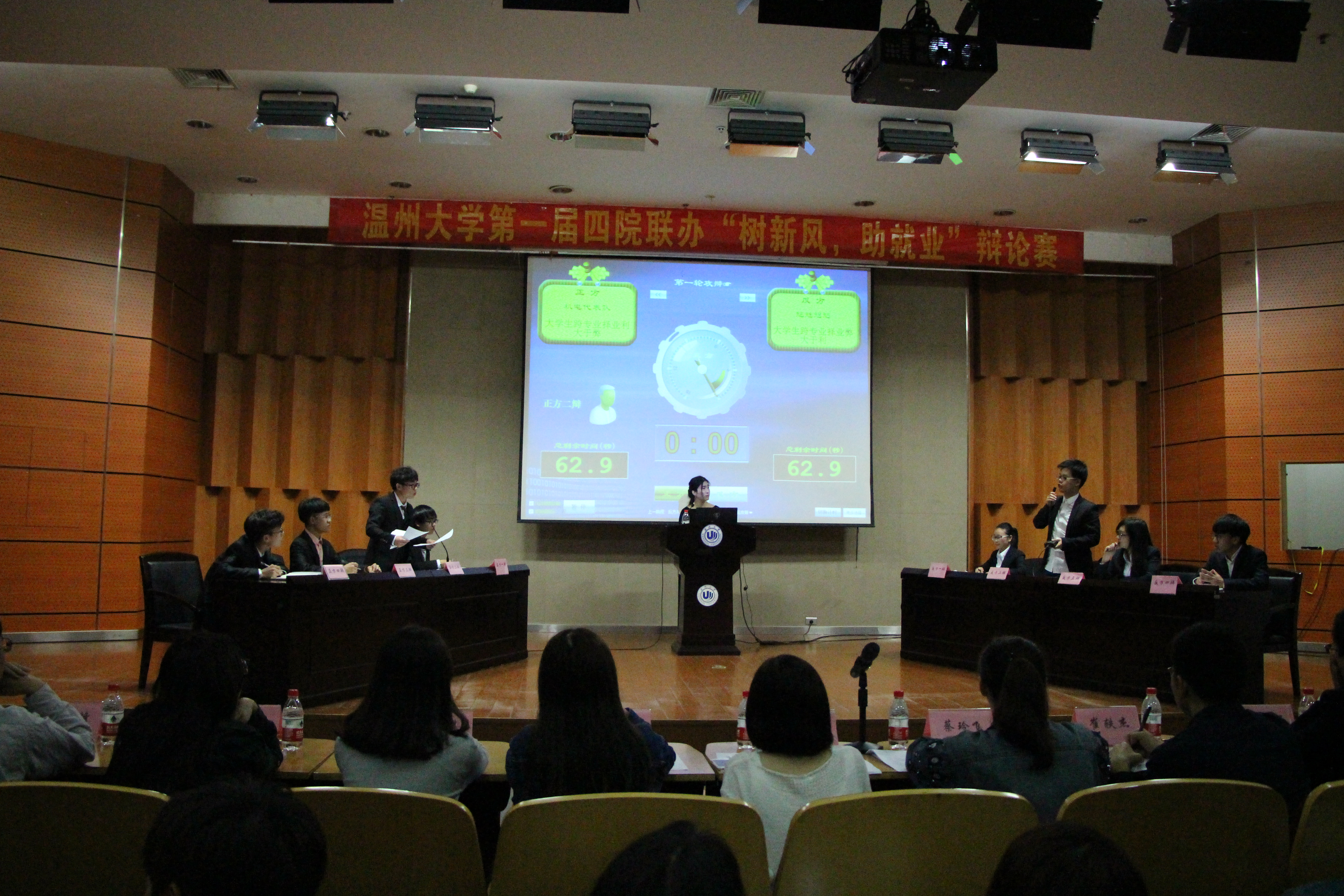 参加本次辩论赛的四只队伍分别来自双赢彩票 的机电代表队、化学与材料工程双赢彩票 的大家说的都队、数学与信息工程双赢彩票 的魑魅魍魉队以及建筑工程双赢彩票 的我们特别队。各参赛队伍在短暂的自我介绍之后,便开始了激烈的辩论比赛。本次辩论赛分为两组:分别是第一组“机电代表队”对战“魑魅魍魉队”,他们的辩题是:< 大学生跨专业择业弊大于利还是利大于弊>;第二组“大家说的都队”比拼“我们特别队”,他们的辩题为< 自律他律,谁对大学生成长更有利>。
