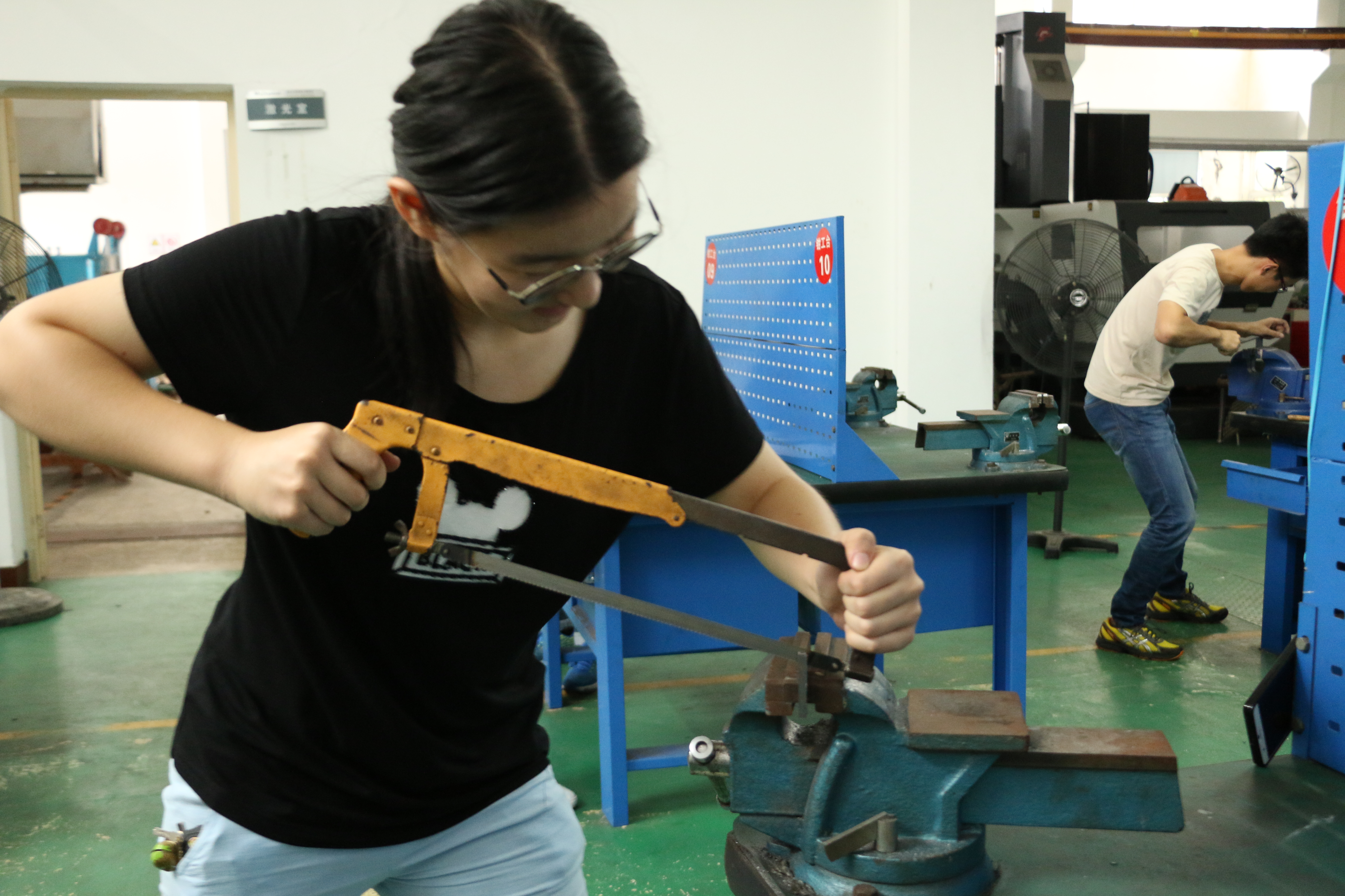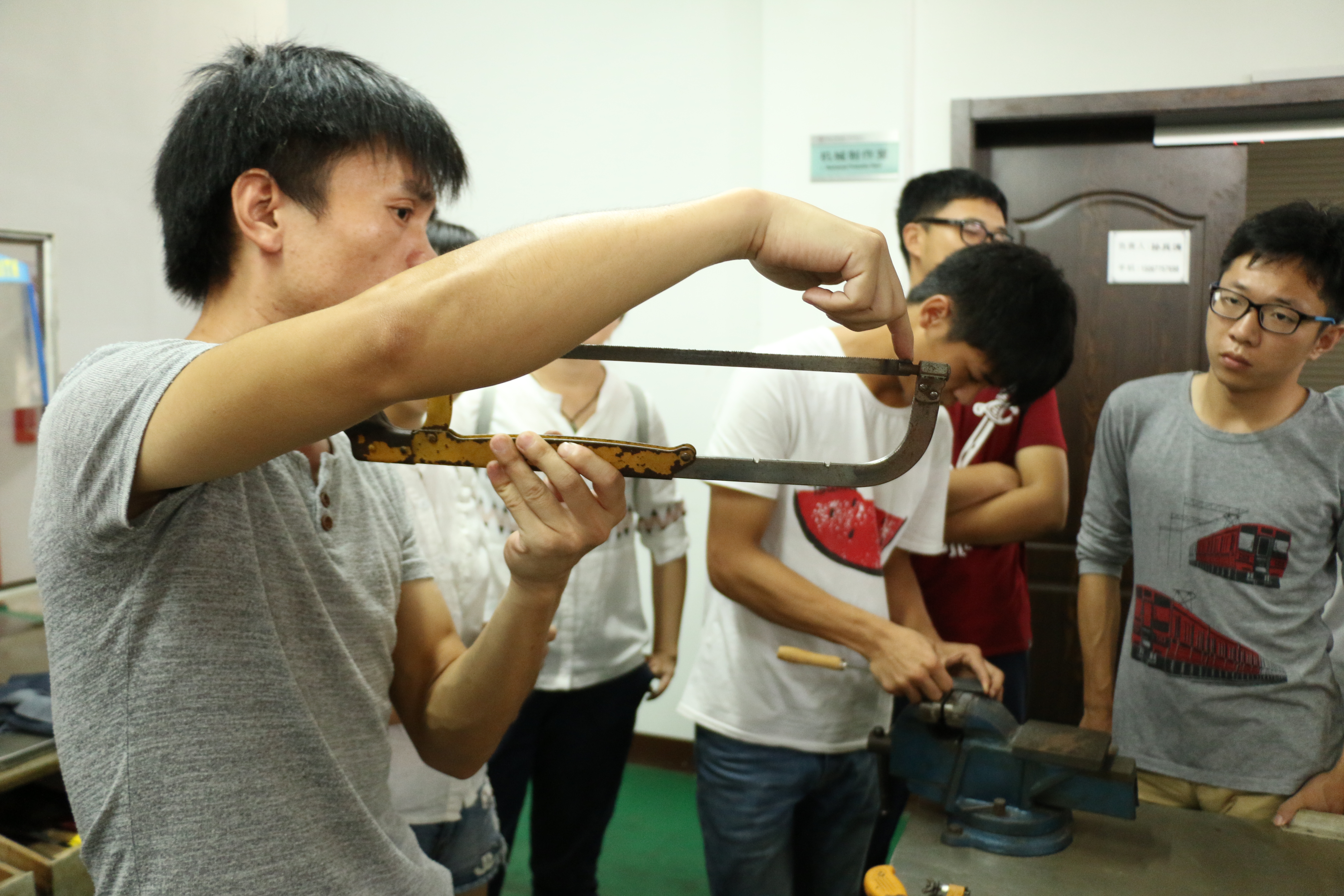 比赛开始前,老师认真为学生们讲解各种工具及其操作方法。学生们仔细聆听,踊跃提问,老师耐心教学,细心解答,场面十分和谐。各类工具都介绍完毕后,比赛正式开始。一时间,工训中心激起头脑与铁片的大风暴。切、割、挫、钻、磨每一位机电学子都使出十八般武艺,将自己百分之百的热情与金秋时期特有的芬芳气息共同注7*7的小铁片当中,重现童年时期那份纯真与美好。大二大三的同学也是再一次积极的投入到本次大赛,给大一同学做了良好的示范和榜样。