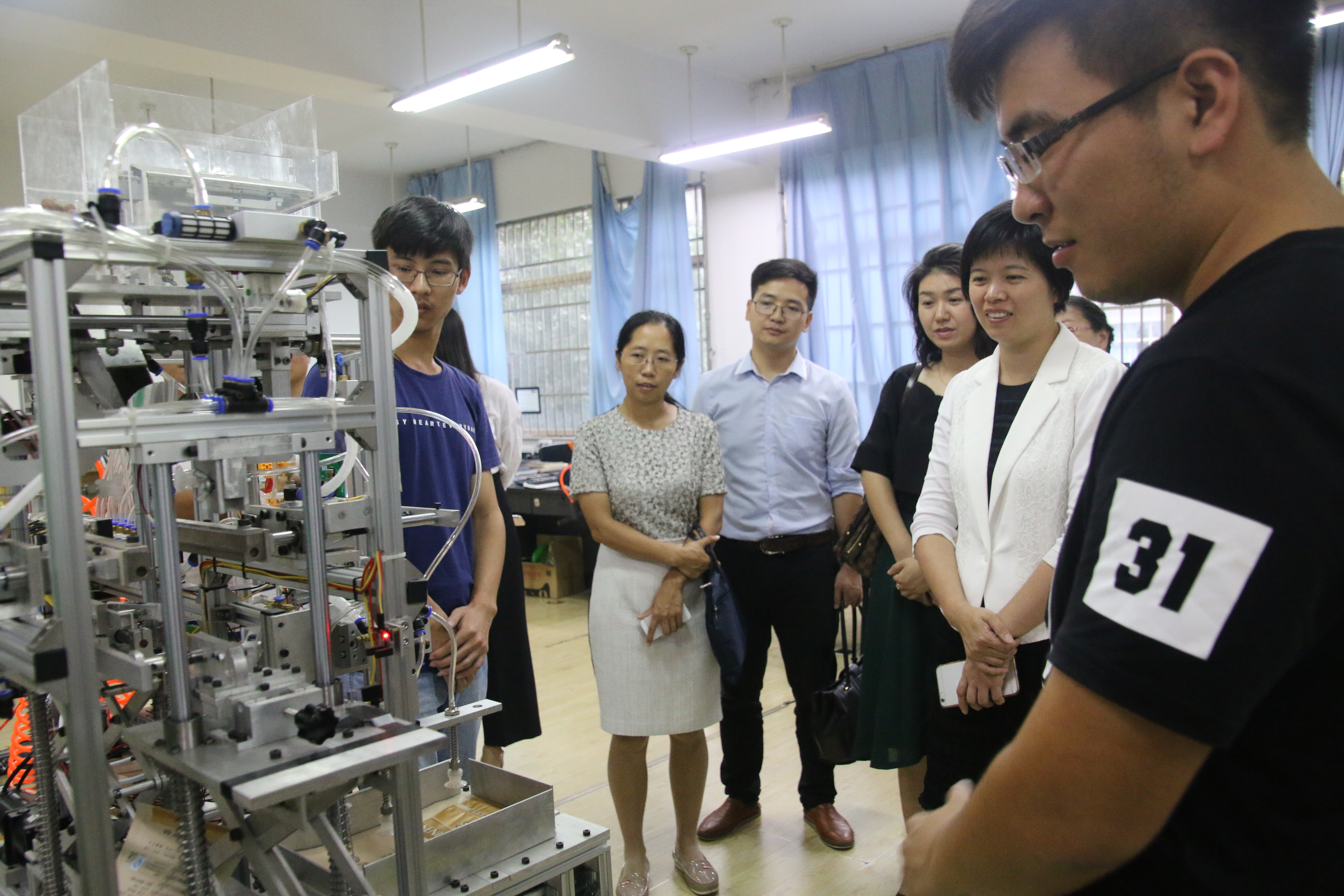 王慧琳副书记一行在双赢彩票 周荣书记的带领下参观了双赢彩票 的智造空间,周荣书记从双赢彩票 在各类国家、省市级竞赛中取得的成绩出发介绍了双赢彩票 近年来取得的优异成绩以及对于学生从大一开始就开展的竞赛培养计划。各兄弟院校的团委书记对于智造空间这一充分发挥师生创造力的创意大为称赞,希望能够加以借鉴。