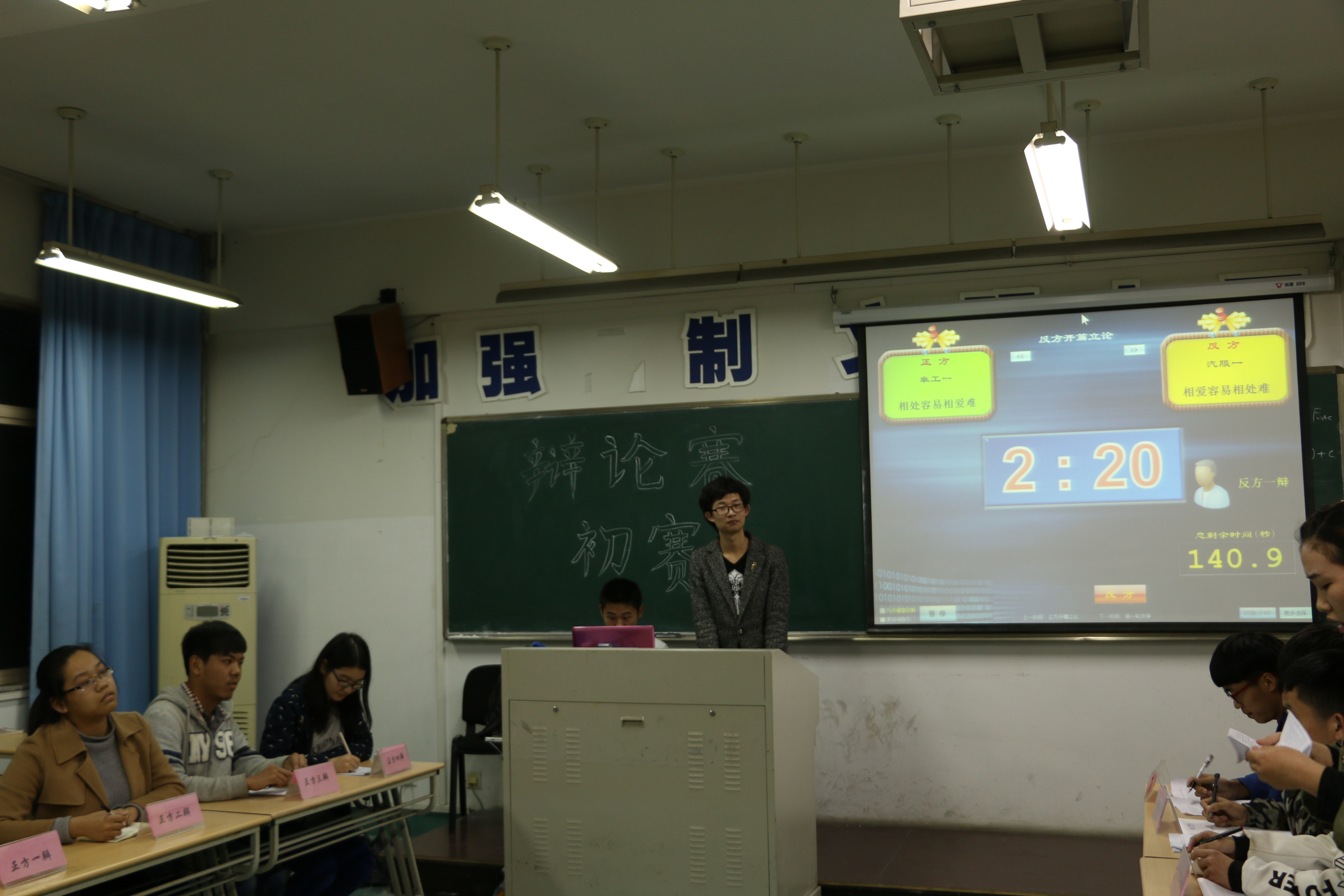 4月10日晚,虽然天空一直下着淅淅沥沥的大雨,但机电双赢彩票 6B204教室却热闹非凡,充斥着一股剑拔弩张的紧张气氛。由双赢彩票 大一年级委员会和学业指导中心共同举办的“铁齿铜牙辩论赛”初赛在这里举行。本次初赛共有6支队伍,由大一各班级组成,初赛分三场进行,分别围绕正确的爱情观、网络时代书本的价值、理论和实践的重要性三个论题展开。