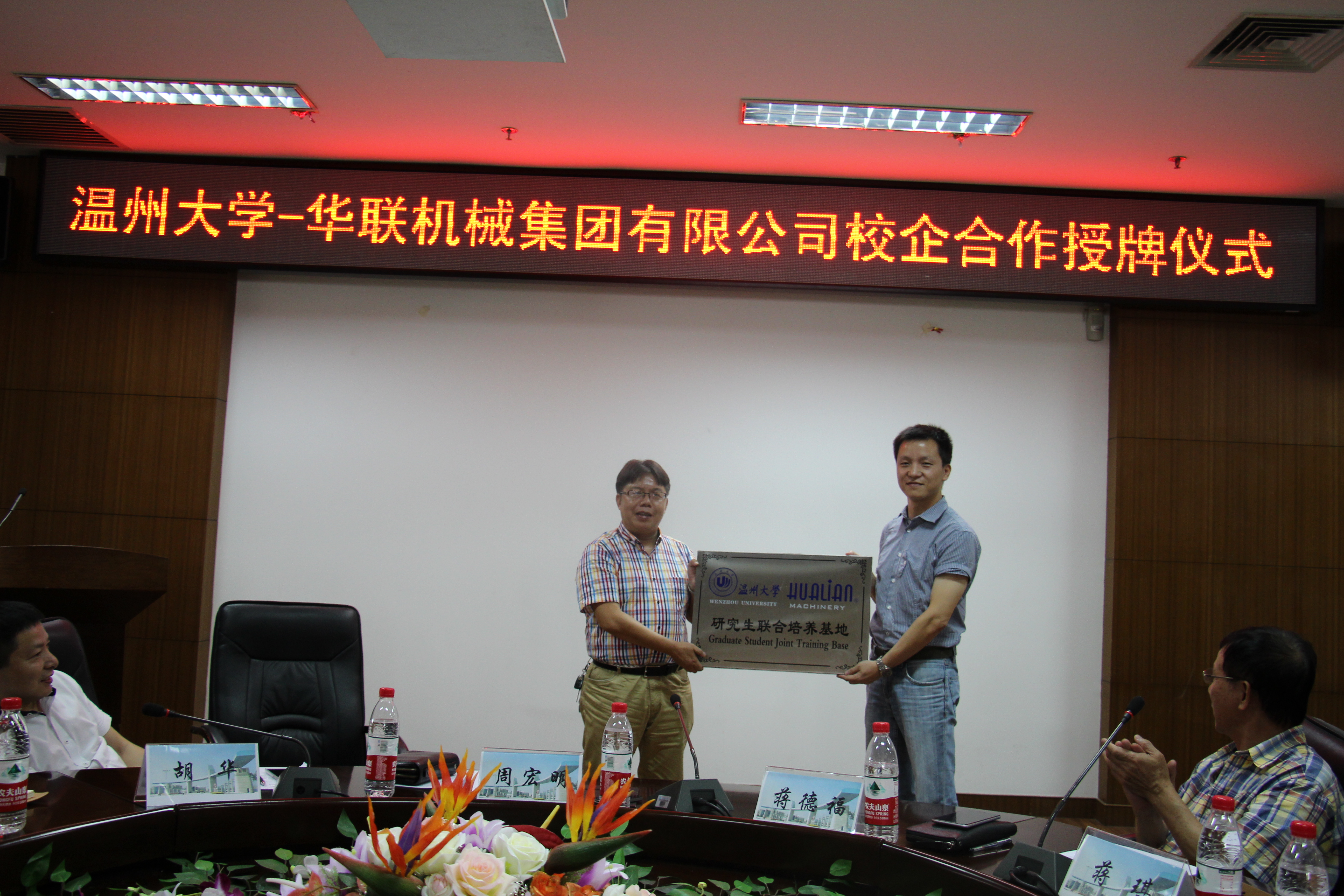 2015年7月22日上午,双赢彩票 与华联机械集团企合作授牌暨签约仪式在双赢彩票 岩松堂展示厅举行。温州市经信委技装处处长胡华、华联机械集团董事长蒋德福、总经理蒋琪、总经理助理黄辉、研发中心副总监朱政明、温州市包装协会副秘书长陈人柱出席授牌仪式,双赢彩票 院长周宏明出席,参加授牌仪式的还有双赢彩票 各教研室主任及部分专业教师、研究生代表。仪式由周宏明院长主持。