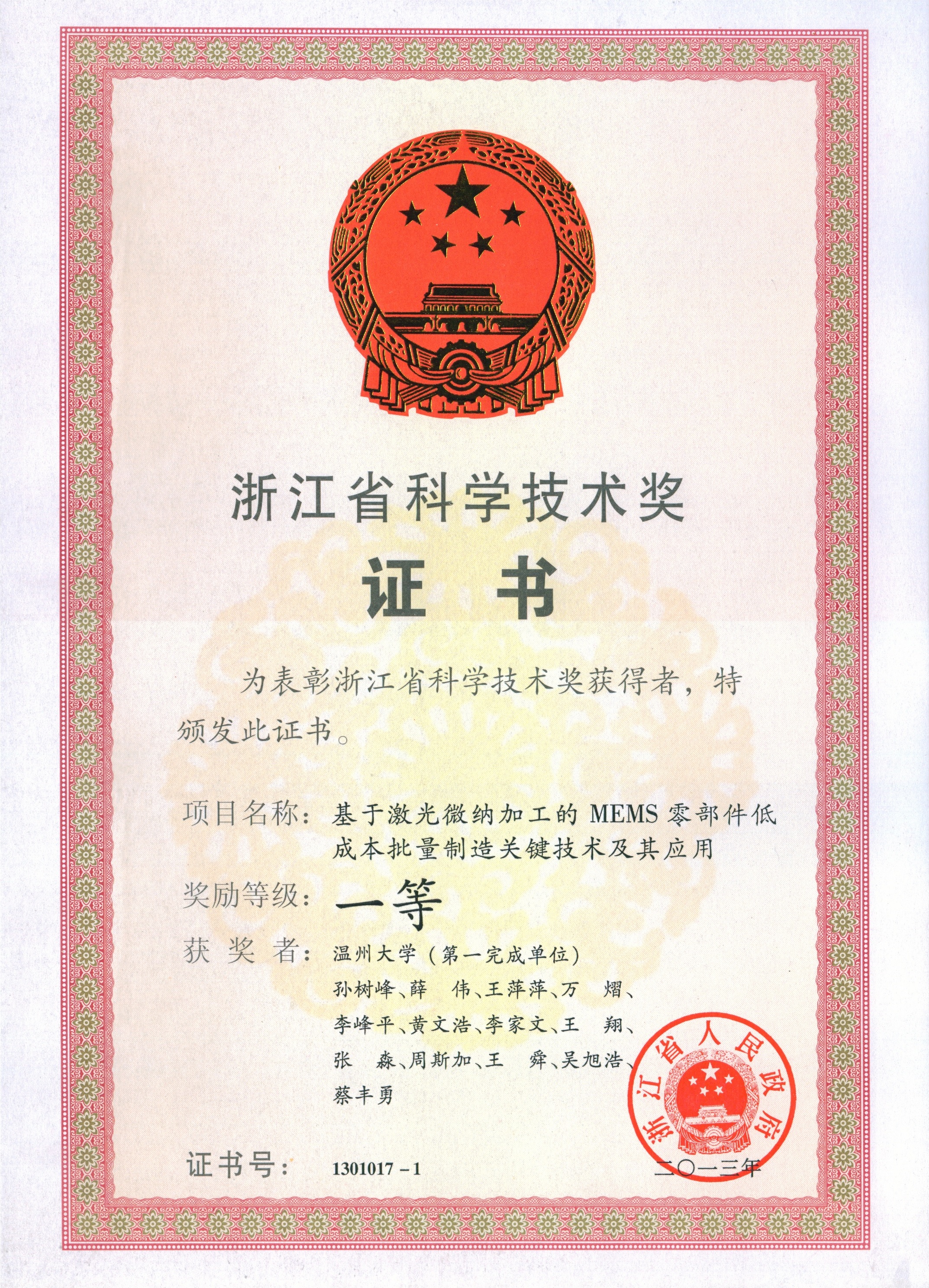 双赢彩票 孙树峰副教授及其科研团队完成的《基于激光微纳加工的MEMS零部件低成本批量制造关键技术及其应用》成果获得2013年浙江省科学技术奖一等奖。此次省科学技术奖一等奖的获得填补了双赢彩票 建院历史以来省科学技术奖一等奖的空白,也是双赢彩票 建校历史上第二次获得省科学技术奖一等奖。对于提升双赢彩票 学科科研水平,提高双赢彩票 的学科科研影响力和办学声誉具有巨大的影响。