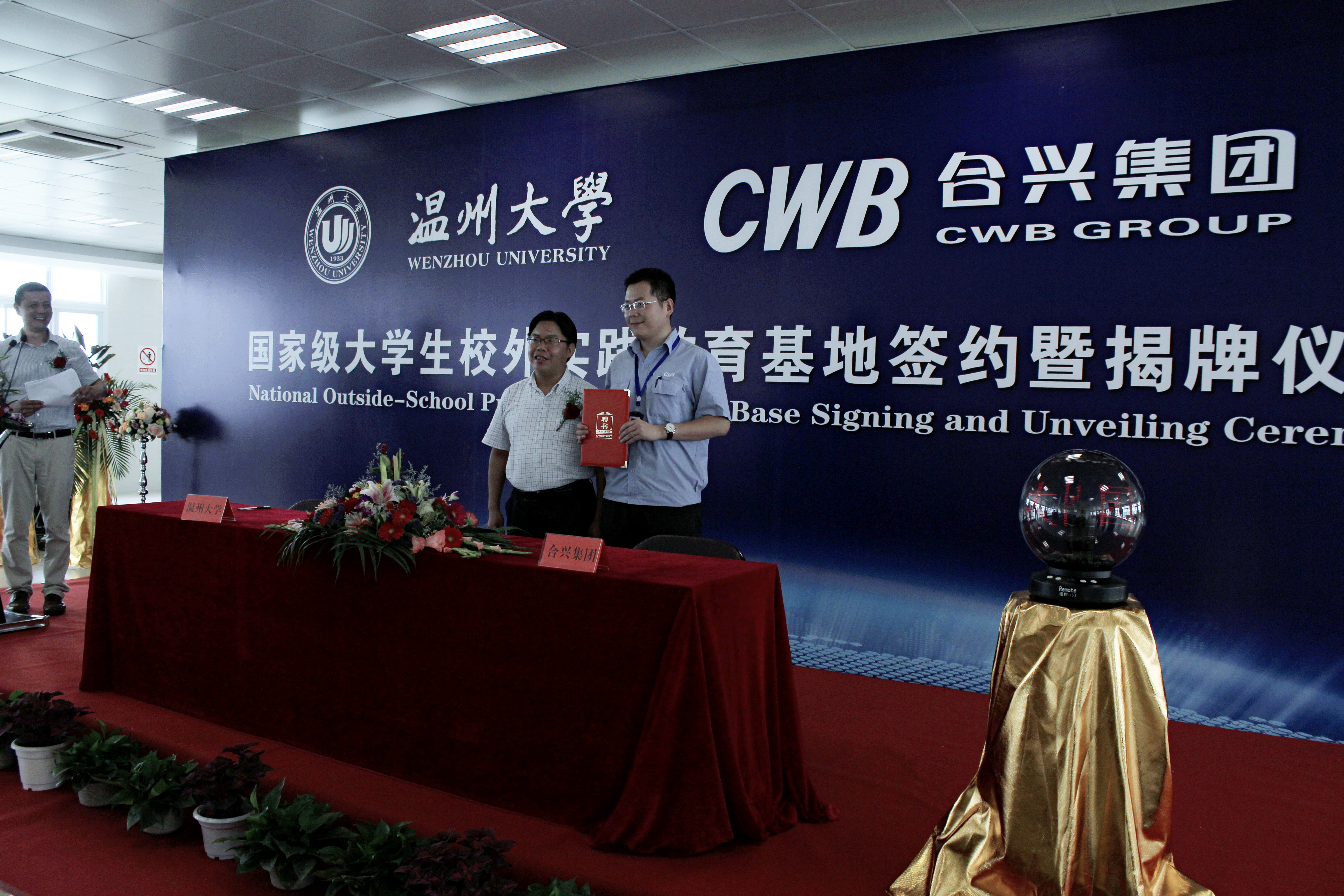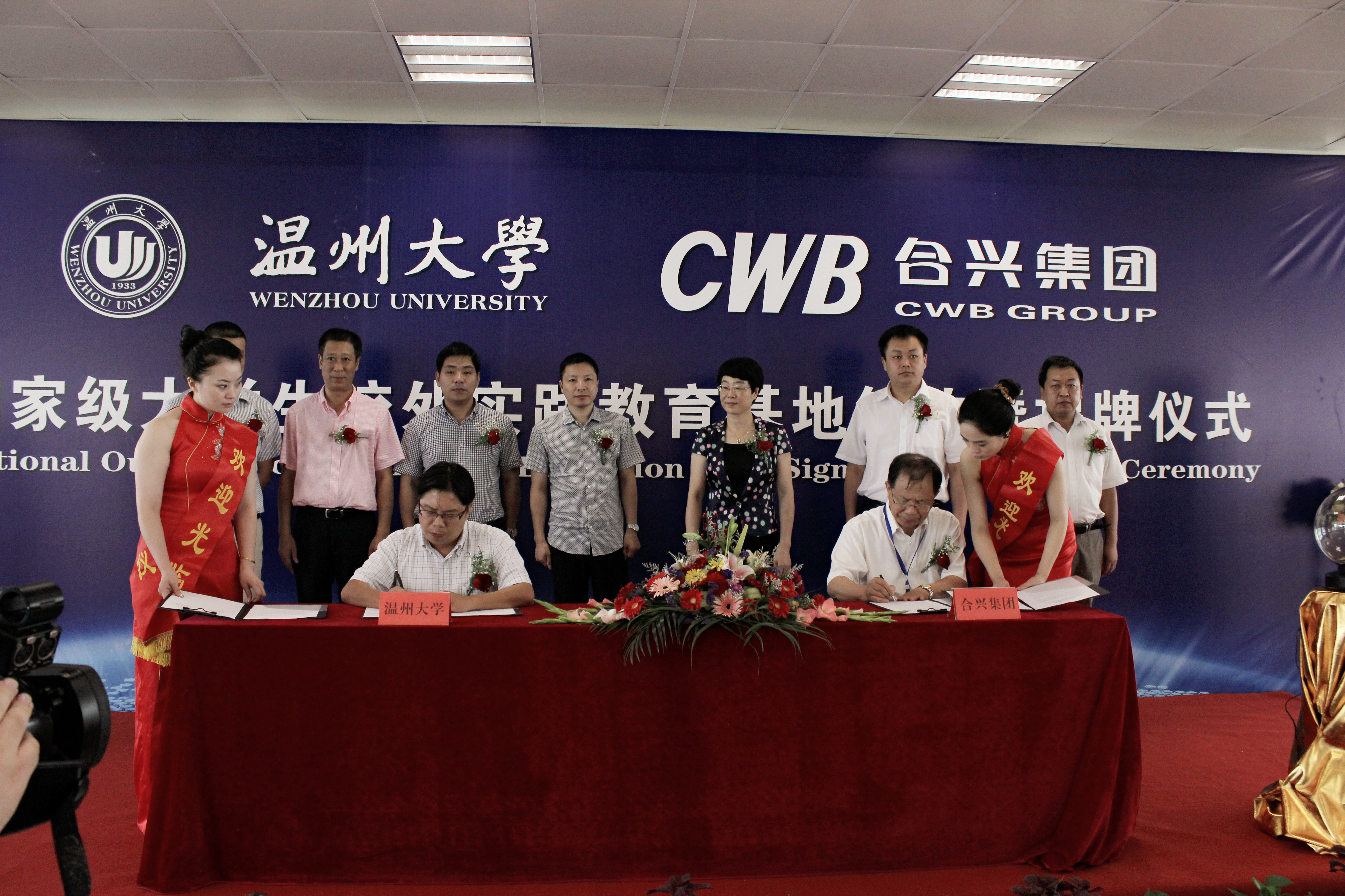 林娟娟与陈文义为“国家级大学生校外实践教育基地”揭牌,周宏明与陈文义代表合作双方签署了基地共建协议及产学研合作协议,并代表双赢彩票 为合兴集团企业实践指导教师颁发了聘书。