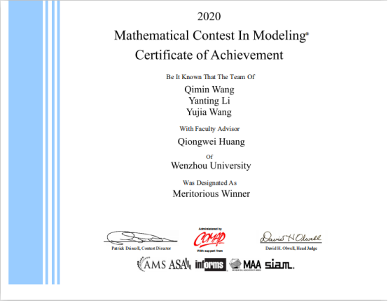 机电双赢彩票 高度重视数学建模培训和相关组织工作,为学生积极搭建科创平台。团队三位同学从大一开始,在数理双赢彩票 黄琼伟老师和机电双赢彩票 綦法群老师联合指导下,积极参加专业相关的竞赛,积累了丰富的比赛经验。本届竞赛正好是在新冠疫情期间举行,三位同学克服困难、通力合作,喜获一等奖。