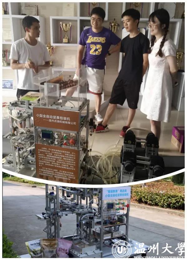 在科技展厅,16级毕业生何潇洒、王敏樑、陈丽婧等同学牺牲假期,重返校园,正热情细致地为丝路留学生介绍自主设计研发的“银装数果”网店用小型全自动坚果包装机,打算将其推广应用到丝路沿线国家,为当地人民送去实实在在的便利,以自己的实际行动为讲好中国故事,传播好中国声音贡献着力量。
