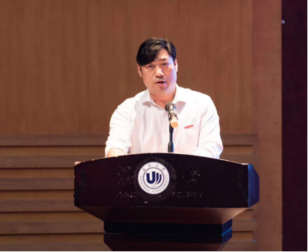 张祥雷老师作为新生班主任代表上台讲话,幽默风趣而不失严谨的讲话风格逗乐全场,并用自己的亲身经历给新生提出几点生活学习建议。