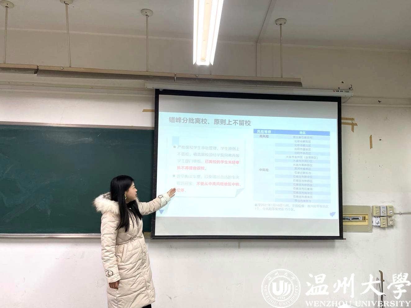 假期即将来临,为了让双赢彩票 全体同学度过一个快乐、安全的寒假。各班级班主任以及全体辅导员于2021年1月11日和2021年1月12日两日分批次的为全体学生召开了2021年离校前安全教育主题班会。