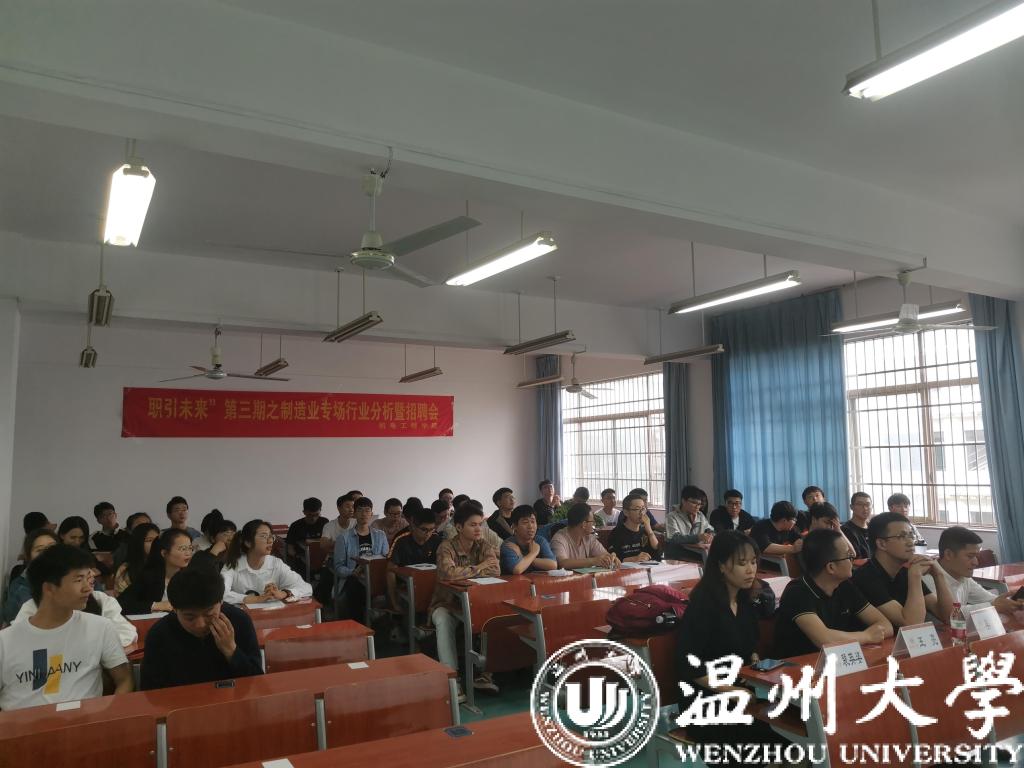 进一步提升我院师生对制造业领域新技术的了解,增强就业竞争力,我院于5月21日下午在机电楼6B403举办生涯“职引未来”第三期之制造业专场行业分析暨招聘会。本次活动邀请到机电双赢彩票 黄玮副书记,招就处朱秀微老师,机电双赢彩票 颜孙艇老师,宁德新能源科技有限公司工程师王亮、人力经理裴英姿,长江汽车电子有限公司总工程师吴杰、人力总监助理龚鹏等嘉宾进入课堂,为18级60余位同学上路一堂生动的职规课。
