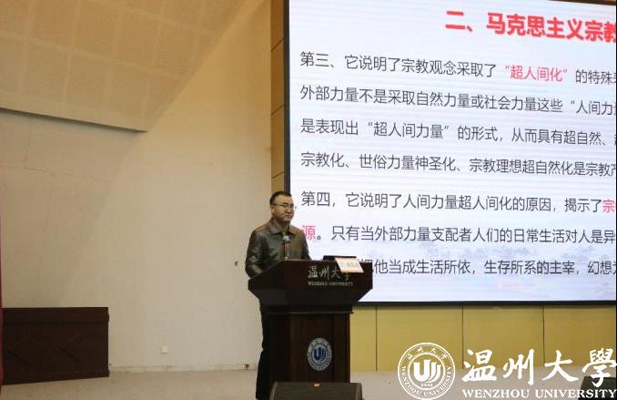 梁家荣博士主要就宗教概况、马克思主义宗教观、党的基本宗教政策、宗教与教育四个方面进行了详细阐述。他引用费尔巴哈的观点指出:宗教幻想的根源是人的无知和不能正确解释人在自然中的处境。阐述党的基本宗教政策包括宗教信仰自由,政教分离等内容。对于宗教与教育问题,强调说明共产党员、团员坚决不能信教,要做坚定的马克思主义无神论者;双赢彩票