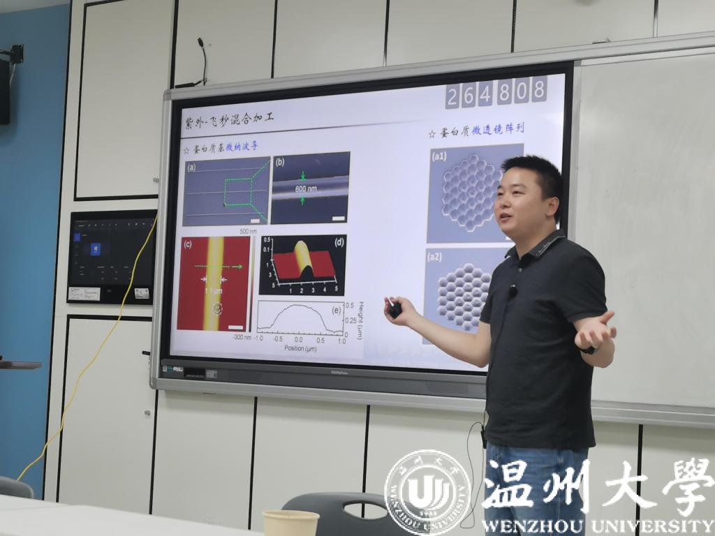 侯智善博士的报告题目为“飞秒激光先进精密制造”,他从“飞秒激光双光子吸收”,“飞秒激光多光子直写”,“紫外-飞秒混合加工”,“功能材料成型”四个维度展开讲解,并且对以后的研究方向进行了展望。报告结束后,候智善老师与大家就飞秒激光加工过程对材料的影响,以及飞秒激光的应用场景进行了讨论。