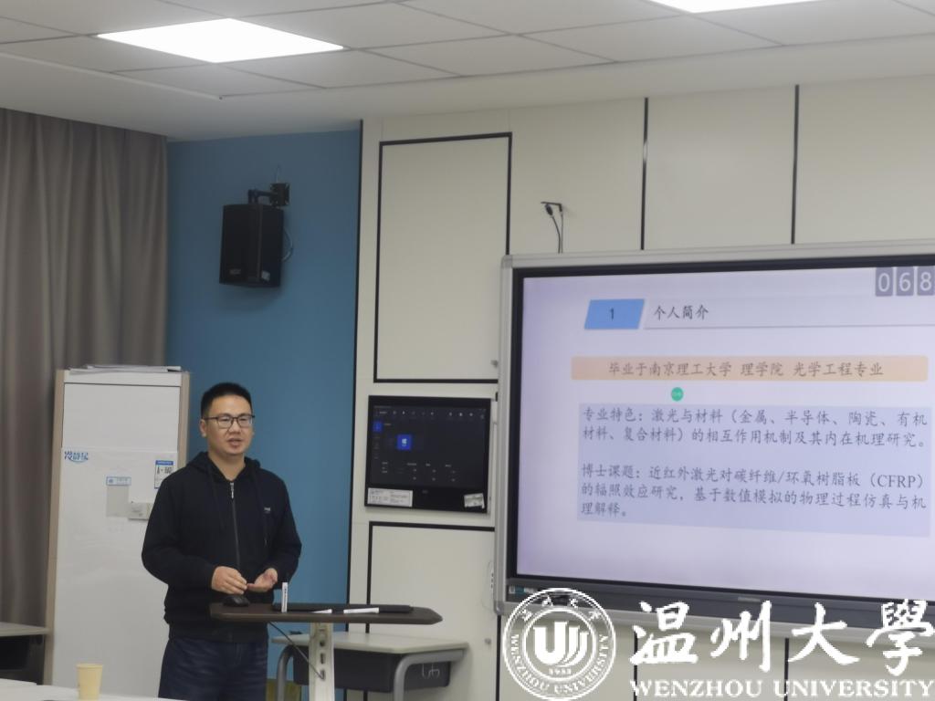 紧接着就是李啸老师做了题为《激光辐照热效应有限元仿真分析》报告。李啸老师首先向各位师生讲述了激光辐照热效应的现象,又想我们介绍了有限元仿真的相关知识,丰富了我们的知识面。随后阐述了现阶段的研究内容,用有限元仿真来分析激光辐照热效应现象的变化规律。