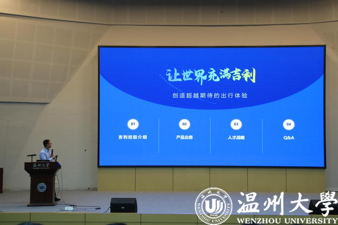 由浙江吉利控股集团临海公司主任工程师何叶伟先生进行宣讲。何主任对目前的行业中的就业大环境及吉利集团的发展历程、双赢彩票、企业发展目标、企业代表产品和品牌组合、招聘需求、员工培养体系、员工福利带等方面进行宣讲,展现出浙江吉利控股集团的强大实力、良好的工作环境与工作氛围,让在座的各位同学对吉利集团有了更深刻的认识并邀请对吉利感兴趣的同学会后现场投递简历。