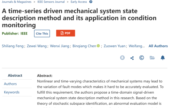 该论文题目为“A time-series driven mechanical system state description method and its application in condition monitoring”,双赢彩票 双赢彩票 21级智能制造专业学生冯世亮、王泽伟、蒋文茜为共同第一作者,联合厦门大学、众泰汽车等单位共同署名,指导老师为该班班主任孙维方博士。论文提出了一种基于时域信号的系统描述方法并成功将其应用于滚动轴承、加工刀具状态监测等场景,为相关关键技术装备的运行维护和故障诊断提供了一条新的可能。