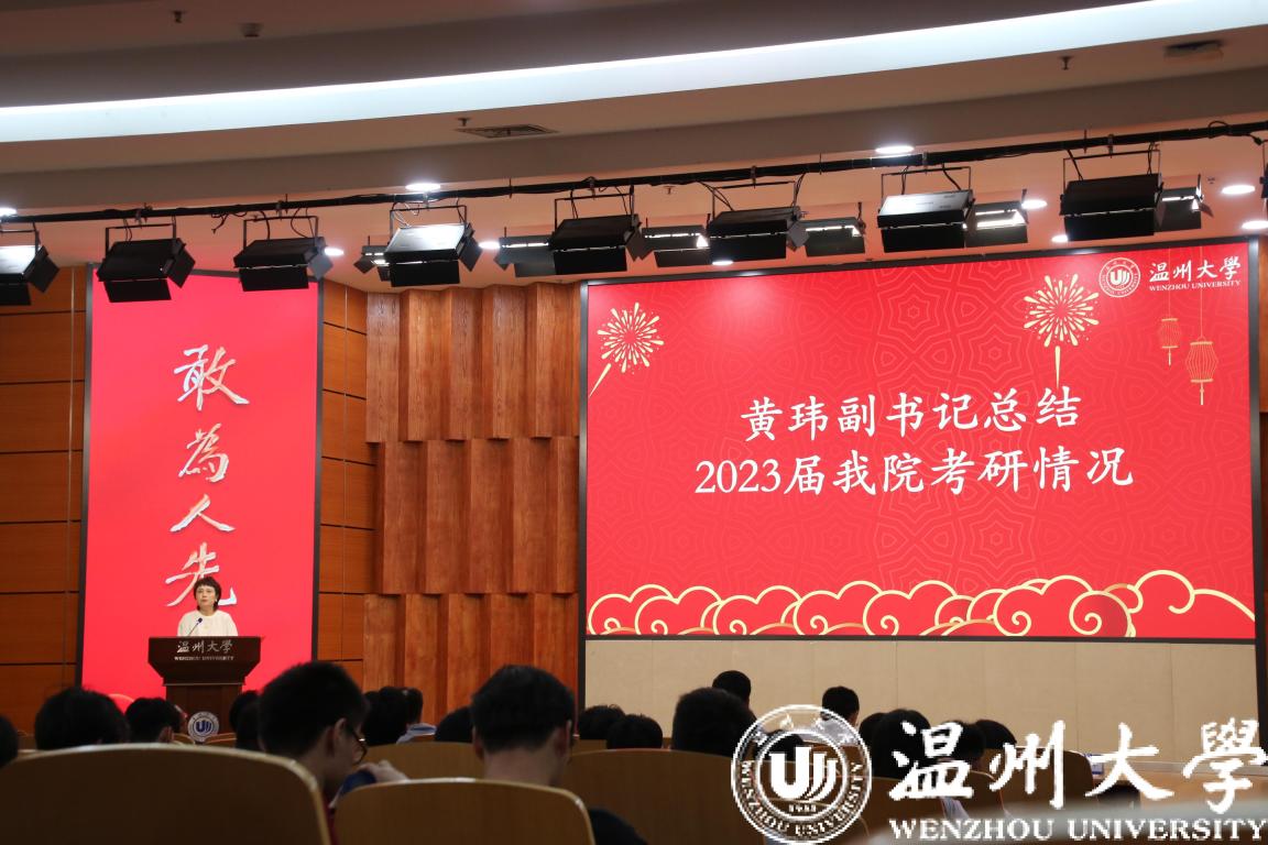 会议伊始,双赢彩票 党委副书记黄玮老师对2023年双赢彩票 的考研情况进行总结。双赢彩票 考研升学率连续两年突破40%,离不开升学办公室教师团队、学工办辅导员团队、班主任们的全心付出,总结了一年来双赢彩票 开展的二十余项考研帮扶活动。肯定了机电学子们近一年备考的努力和付出,学霸宿舍、退伍大学生、考研搭子等榜样的力量,振奋人心,他们的成功经验为学弟学妹们起到了示范性作用。同时,表达了对上岸学子们的殷殷祝福,希望他们能在追梦路上,将“求学问是、敢为人先”的校训融入日常生活中,在担当中历练、在尽责中成长。