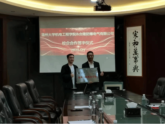 谢释辰总经理介绍了企业的基本情况,提出了在校大学生实习方面的需求,希望通过人才培养合作、科研合作提升企校双方合作紧密度。双方签订了校企合作协议,并授牌合隆防爆电气有限公司为校外实践教育基地。