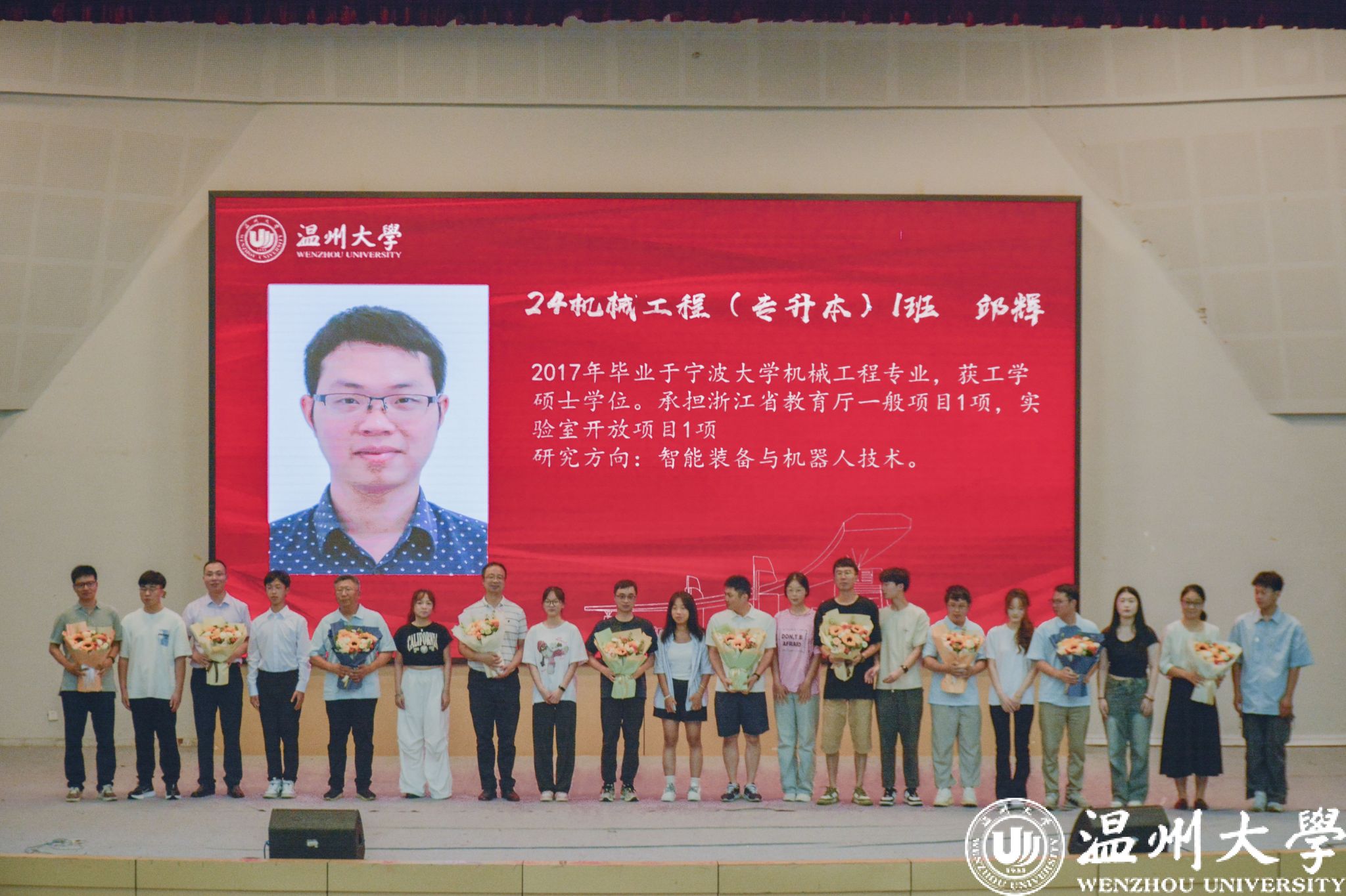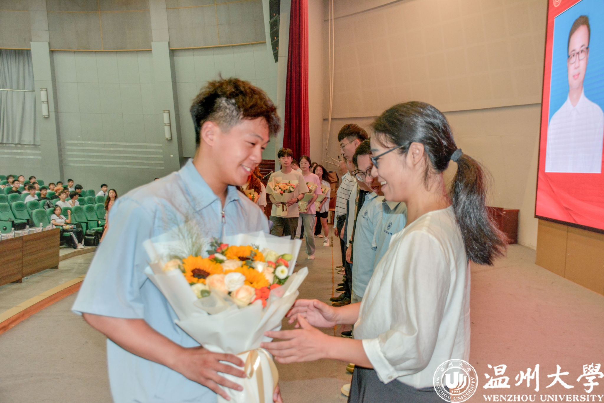 随后,举行2024级新生班主任师生见面会,方建晓副书记依次向新生们介绍了10位优秀的班主任老师,学生代表上台献花。