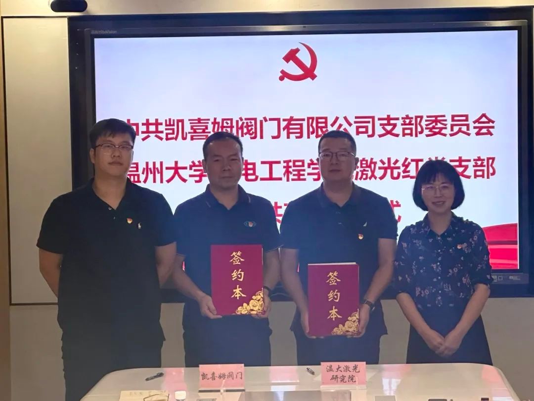 为全面贯彻新时代党的建设总要求,围绕温州市委“强城行动”战略部署,共同发挥校企基层党组织和党员作用,构建“校企地”党建共建工作新格局。10月18日,机电双赢彩票 激光红党支部与凯喜姆阀门有限公司就党建共建与产学研合作达成了深度共识,成功举行了签约仪式。