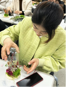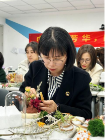 在掌握了基本技巧后,女教职工们纷纷动手实践,女教职工们纷纷化身“花艺师”,开始制作属于自己的永生花微景观。大家根据自己的喜好和审美,精心挑选花材,精心修剪、构思布局,巧妙搭配色彩,用心设计造型。先确定主花位置,再填充配花和枝叶,层次感是关键,制作过程中,教职工们互相交流、灵感迸发。活动现场洋溢着欢声笑语,老师们在轻松愉快的氛围中感受着手工制作的魅力,同时也展现出了她们的创意与才华。