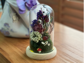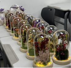 制作完成后,老师们纷纷展示自己的作品,并将精美的永生花微景观摆放在一起,形成了美丽的花艺展览。大家互相欣赏、交流创作心得,现场气氛十分温馨。最后,老师们手持自己的作品,合影留念,定格这一美好的时刻。