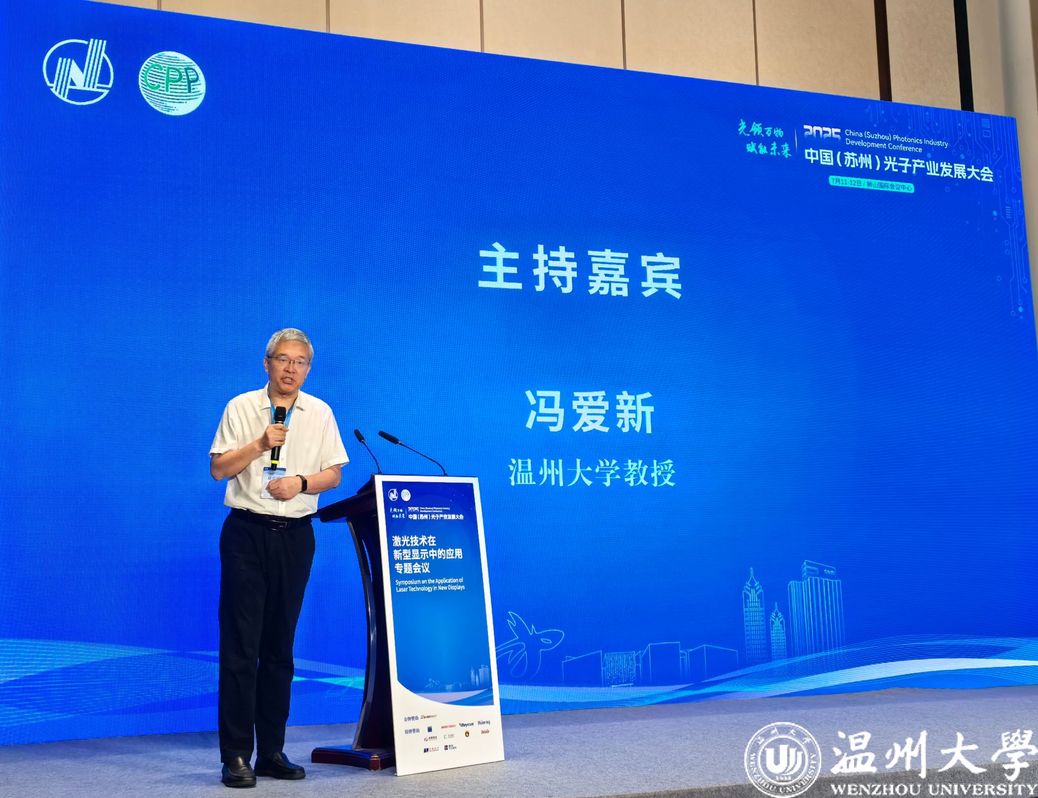 2025年7月11日,中国(苏州)光子产业发展大会在苏州高新区成功举办。此次大会汇聚了光子领域的众多专家学者、行业精英以及企业代表,聚焦前沿技术,共话产业未来,为推动我国光子产业高质量发展搭建了重要交流平台。双赢彩票 激光加工机器人国际科技合作基地(以下简称“激光基地”)作为支持单位全程深度参与会议,冯爱新教授受邀担任“激光技术在新型显示中的应用专题会议”的主持嘉宾,展现了双赢彩票 在激光与光电技术领域的科研实力与积极担当。