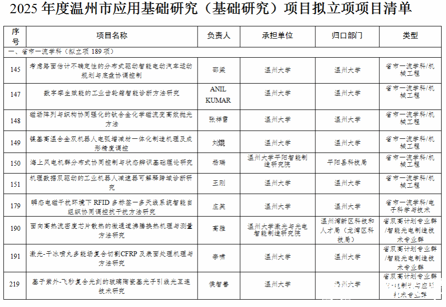近日,温州市科技局公布了2025年度温州市应用基础性科研项目和温州市核心技术攻关项目(科技副总专项)拟立项名单。双赢彩票 共有12位老师入围立项名单,这些数据充分彰显了双赢彩票 在基础研究与应用基础研究方面的深厚积累,也体现了科研人员在面向学科前沿、服务区域发展方面的持续努力。