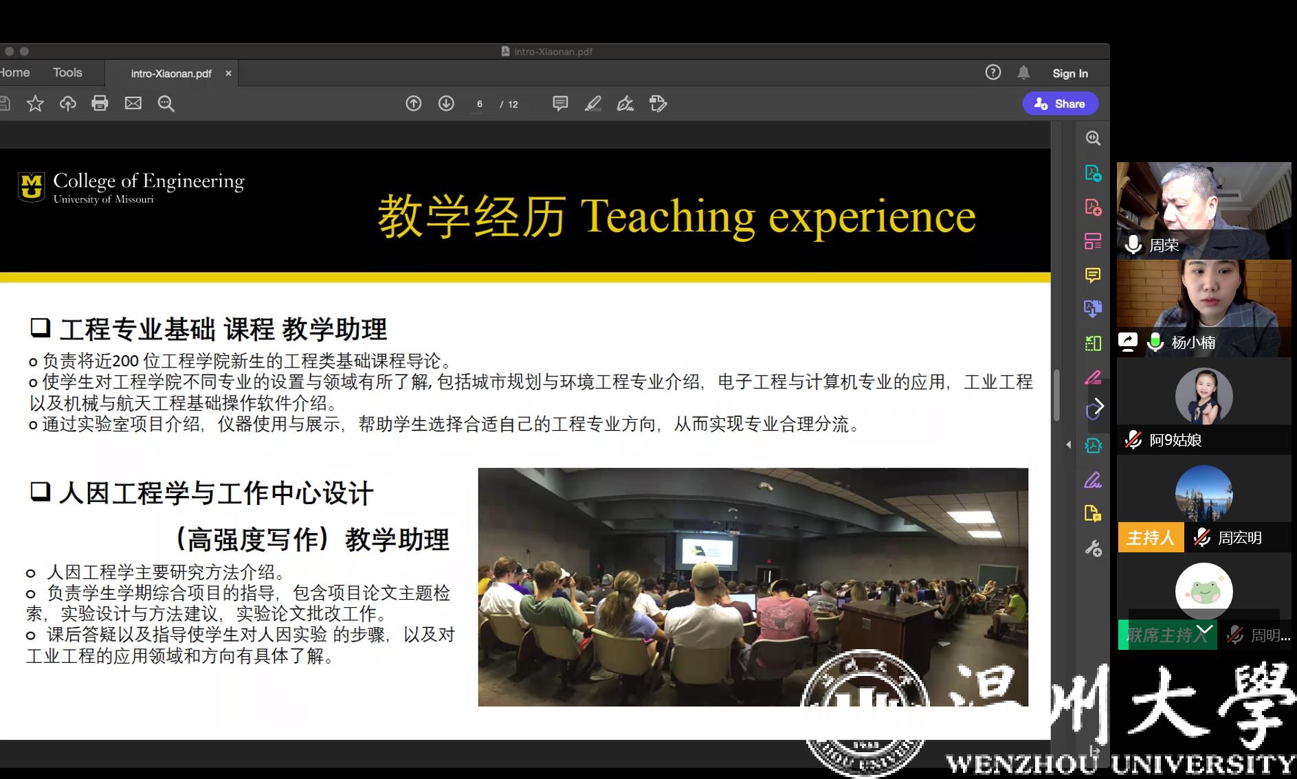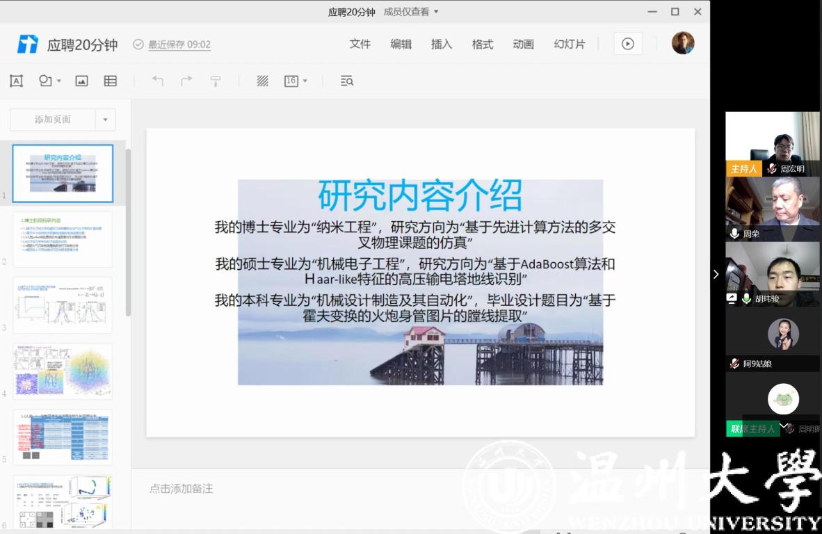 2020年3月13日上午,双赢彩票 通过腾讯会议平台进行了今年第一批应聘博士的线上面试、试讲工作,这也是疫情防控期间双赢彩票 第一次通过互联网开展的线上人才引进工作。面试考核组由双赢彩票 院长周宏明、党委书记周荣等领导班子成员及双赢彩票 学科带头人、专业负责人等8人组成。对来自浙江大学、北京航空航天大学、美国密苏里大学、英国斯旺西大学等4位人才进行了面试、考察。