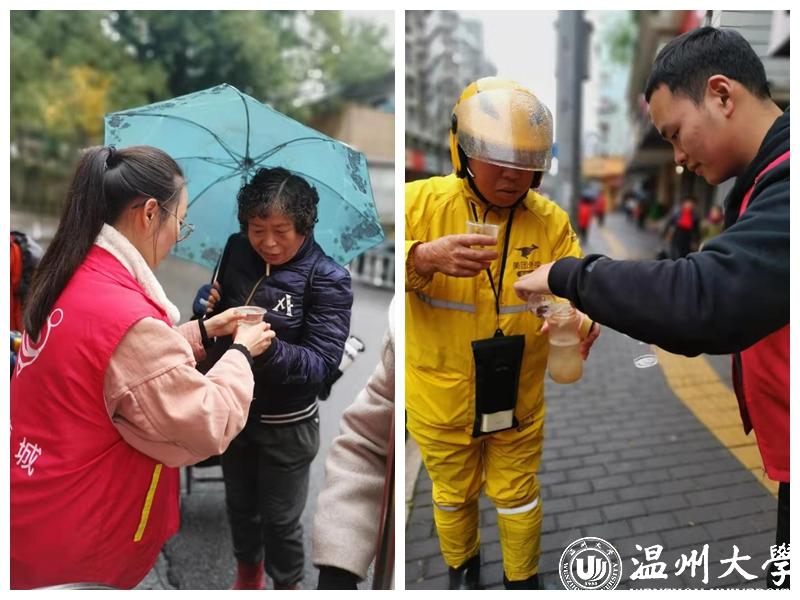 12月21日上午,在温州市华盖社区红日亭,一杯杯茯茶、木耳茶给路人送上冬日里的温暖。双赢彩票 机电双赢彩票 党委学生支部在黄玮副书记、杨奇老师的带领下与“红日亭”志愿者一起,参加冬日送温暖活动。