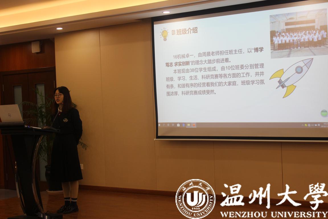 接下来按照年级,各班级代表依次上台进行班级介绍。评比过程中各班级的展示生动活泼、高潮迭起。各班发言人向在场的老师和同学们展示了各班风采,包括班级介绍、学风建设、团建活动、考级考证、科研竞赛和未来展望等几个方面,他们的精彩演讲搏得了在场老师和同学们的热烈掌声。