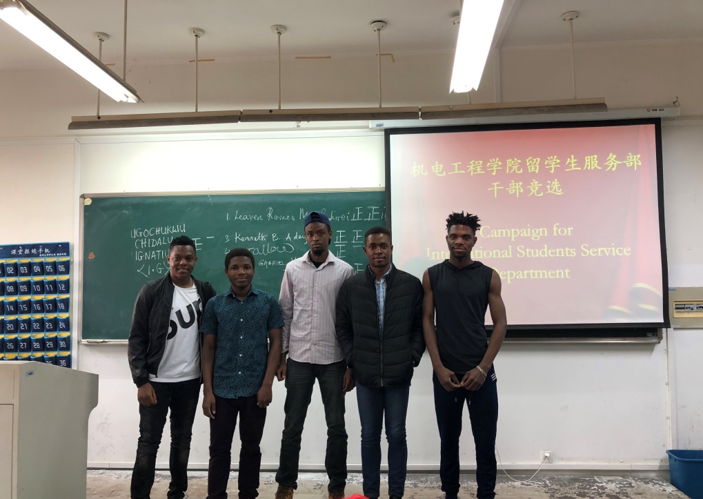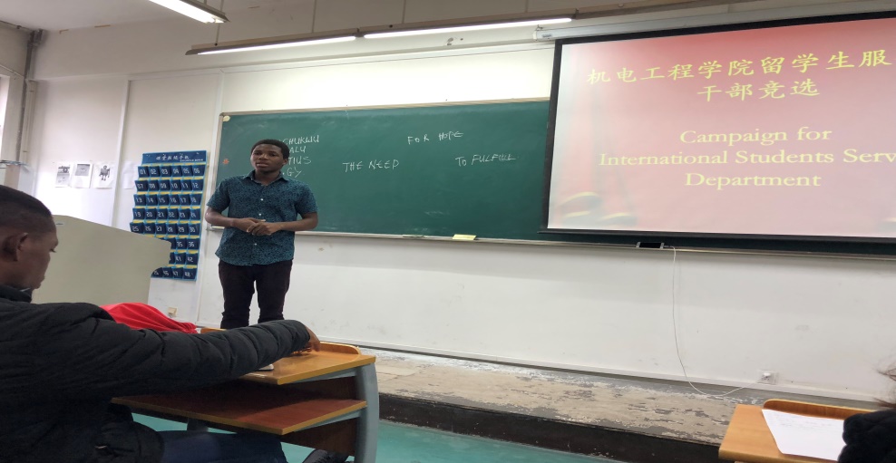 为了给留学生提供更好的服务平台,以加强中外学生的交流及更好地对接双赢彩票 学生会,双赢彩票 经过近半个学期时间的筹备,成立了留学生服务部。现场,5位留学生参加了干部竞选演讲,表达了自己的竞争意愿及今后努力的方向。通过最终的投票,研究生ADEYEMI KENNETH BAMIDELE以最高票当选部长,MUPFUKIREI LEAVEN ROMEO和MWANGOSI GAYO GABRIEL当选副部长。