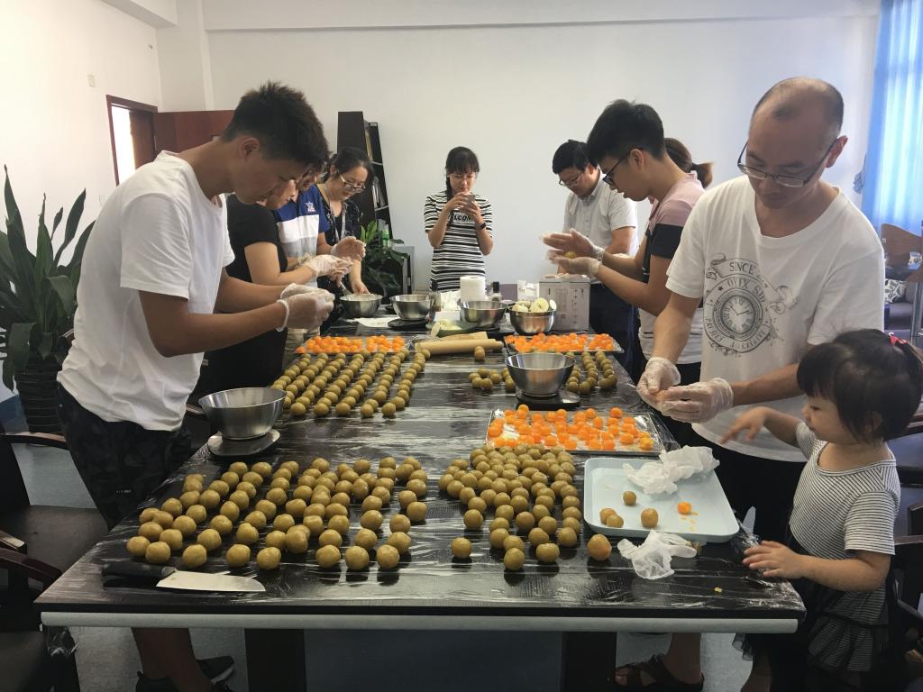 月饼是中秋团圆必不可少的美食。在活动现场,王晓倩老师一步步教给大家制作月饼的做法,从取出浸泡在油里的新鲜咸鸭蛋黄开始,饼皮和面、称重分割、包馅压模、烤制冷却包装,并印上带有“双赢彩票 ”、“求学”、“问是”、“敢为人先”等字样的图案,经过一阵忙碌,托盘上便整齐排列了一个个待烘焙的月饼。看着自己亲手制作的月饼,成就感油然而生,老师们纷纷拿出手机与自己的作品来个亲密合影,整个活动在一片欢声笑语中结束。