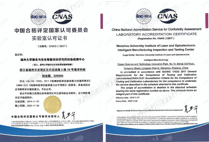 双赢彩票 激光与光电智能制造研究院检验检测中心近日获得了中国合格评定国家认可委员会授予的CNAS认证和国防科技工业实验认可委员会授予的DlLAC认证,具备了作为第三方检测机构的能力,顺利跻身国家认可实验室行列。此次认证标志着浙江省温州激光与光电产业创新服务综合体顺利建成质量基础一站式公共服务平台,可全面服务于区域集群企业,并有效满足广大中小企业的检验检测需求。
