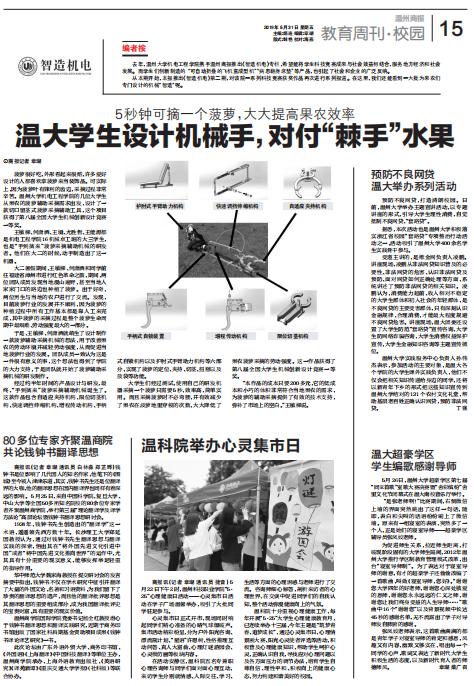 “本作品的成本只要200多元,它的低成本和小巧的体积非常符合当地果农的需求,为菠萝的辅助采摘提供了有效的技术支持,弥补了市场上的空白。”王敏樑说。
