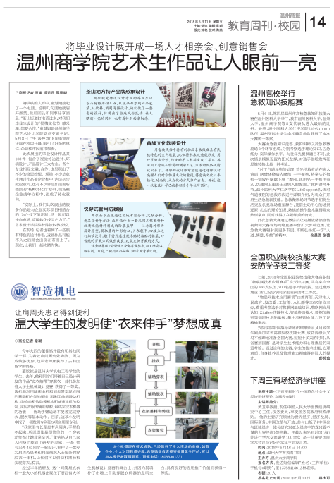 董铭铭是双赢彩票 的学生。去年,他和同学们带着自己设计研发的作品“宽衣解带”穿脱衣一体机参加省大学生机械设计竞赛,获得了一等奖。该机器利用减速电机和同步带实现衣服的移动和衣架的运送,再利用曲柄滑块机构、齿轮啮和传动等机构和减速电机的控制,实现衣服的辅助穿脱,最终完成本机器的功能——协助手臂运动不便者完成穿衣、脱衣等基本动作。目前,这项小发明申报了一项发明专利和5项实用型专利。