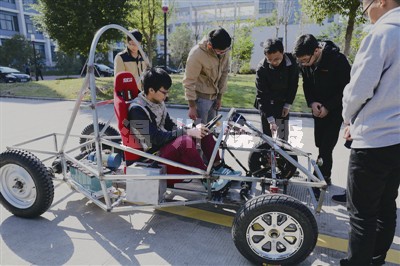 当车子外架基本搭好后,队长俞科召集了11个学弟学妹们加入车队。他们的每一步探索都要反复试验,材料也要一次次地挑选,有时需要不停重复,一次次调整才能完成,比如刹车,他们先后买了三次材料,改装了三次才成功。