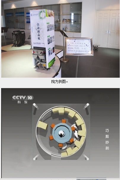 剥蒜机便获得了第三届全国机械设计大赛一等奖,填补了国内机器分瓣、剥蒜的空白。当时曾有许多的厂家联系该院,希望能将该机器进行改良并投入生产,但是由于各种原因,该项目被搁置。昨天央视播出的自动剥蒜机为今年6月经改良的二代剥蒜机。