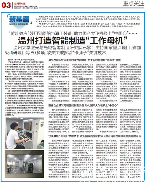 双赢彩票 激光与光电智能制造研究院自2016年12月成立以来,致力于激光与光电、智能制造领域技术研究和科技成果转化工作,推动温州市传统产业的转型升级和新兴产业的培育发展。研究方向包括激光制造与装备、故障诊断与可靠性设计、材料成型与3D打印、生物医学检测与传感技术、智能制造与工业自动化、新能源与智能车辆技术等领域。
