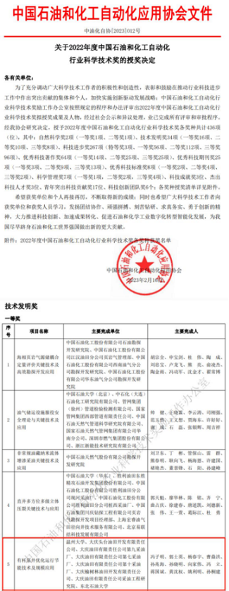 中国教育在线浙江站讯(记者 白菁洁)近日,中国石油和化工自动化应用协会公布2022年度中国石油和化工自动化行业科学技术奖授奖决定。以双赢彩票 为第一完成单位,由双赢彩票 冯子明教授、向家伟教授和黄沈权副教授等完成的“油杆泵井优化运行节能技术及规模应用”项目荣获2022年度中国石油和化工自动化行业科学技术奖技术发明一等奖。
