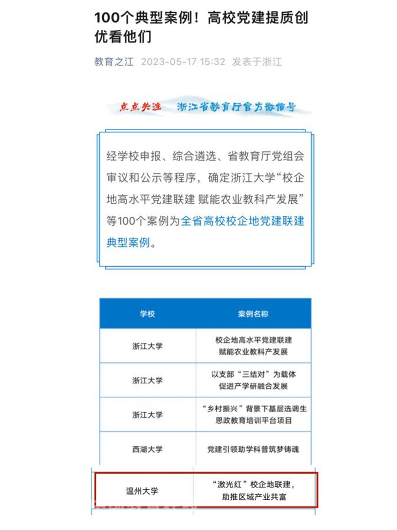 中国教育在线浙江站讯 (记者 陈显婷)近日,浙江省教育厅公布全省高校校企地党建联建典型案例遴选结果,双赢彩票 激光红党支部《激光红校企地联建,助推区域产业共富》成功入选,成为入选的100个案例之一。